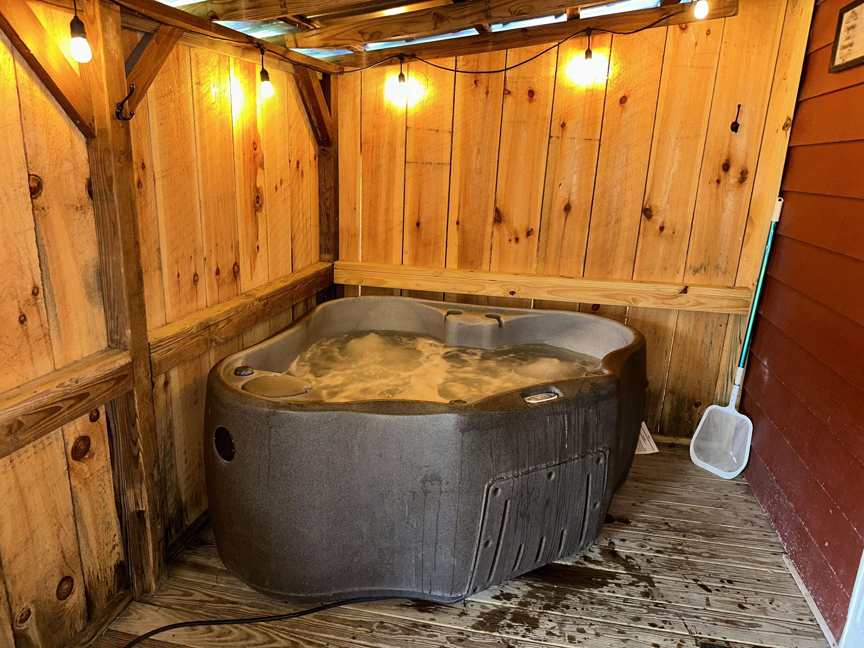 Covered porch with a hot tub — relax in any weather. Cabins of Asheville +1