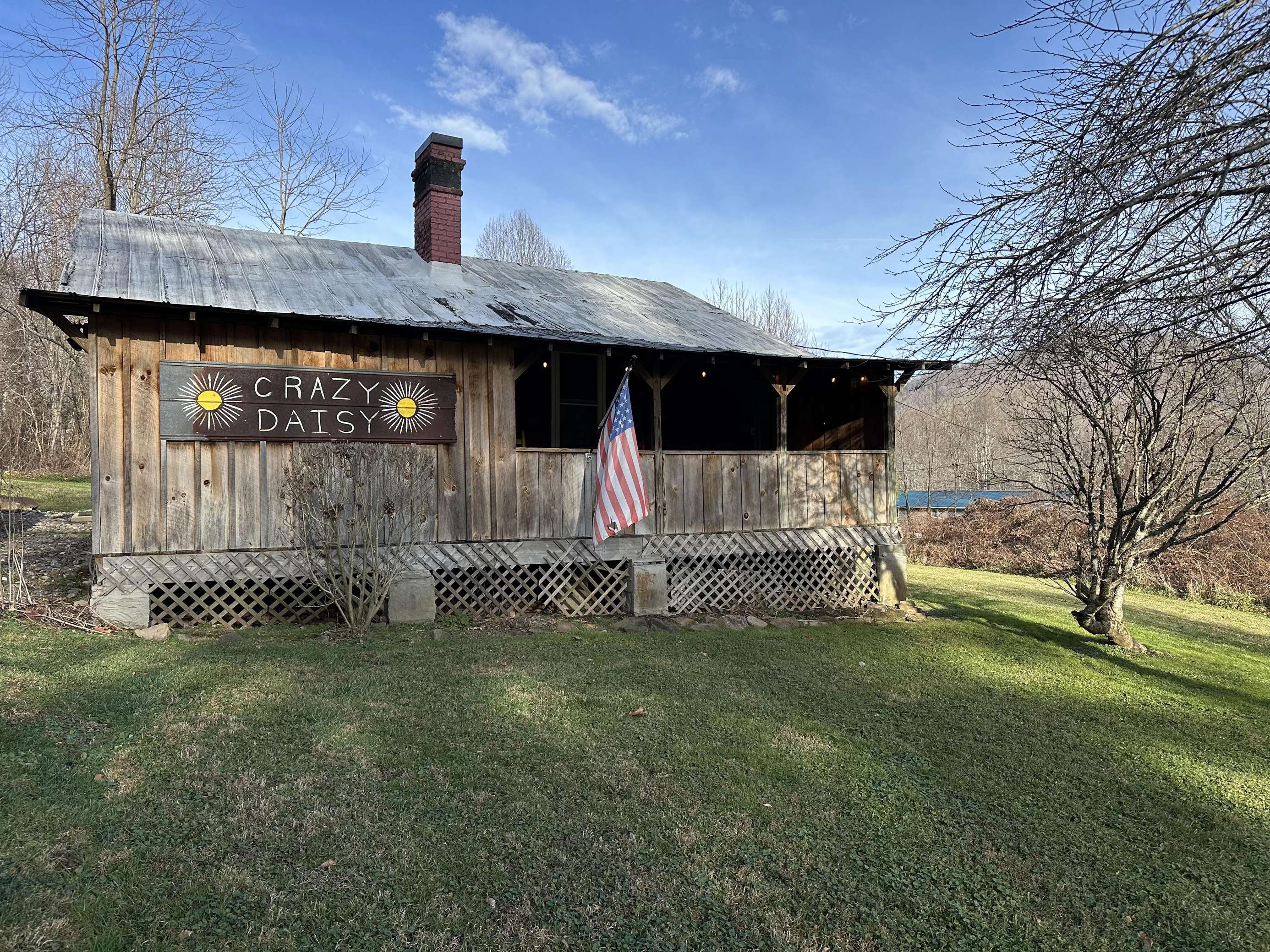 Crazy Daisy is a remodeled 1940s farmhouse with cabin décor. It features electric fireplaces in the living room and bedroom, a king-size bed (no footboard), and a bathroom with a shower. The full kitchen has a granite countertop, refrigerator with ice maker, range, dishwasher, and microwave. Washer and dryer included with towels and linens provided. There's a hot tub on the covered porch, two rocking chairs, and a fire pit for campfires (bring firewood, hot dogs, and marshmallows). Enjoy fast cable Wi-Fi and good cell service, just 10 minutes from the Blue Ridge Parkway and downtown Waynesville, and 30 minutes from Asheville.