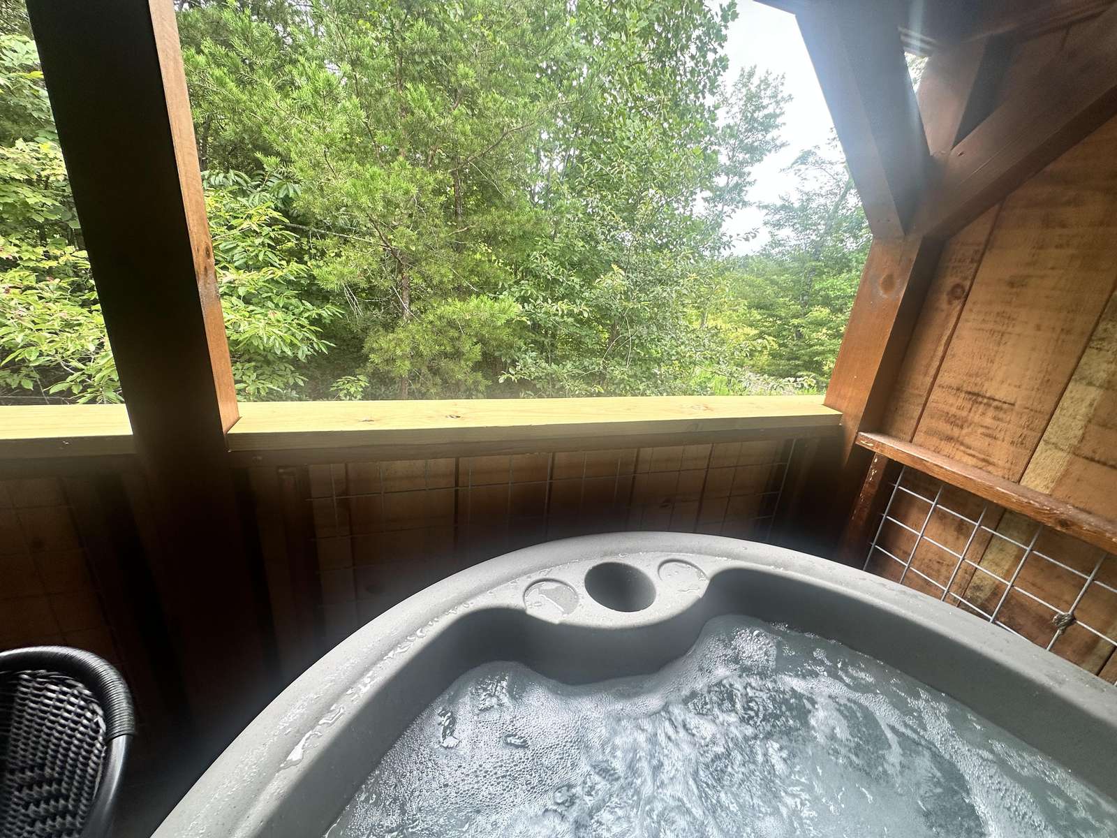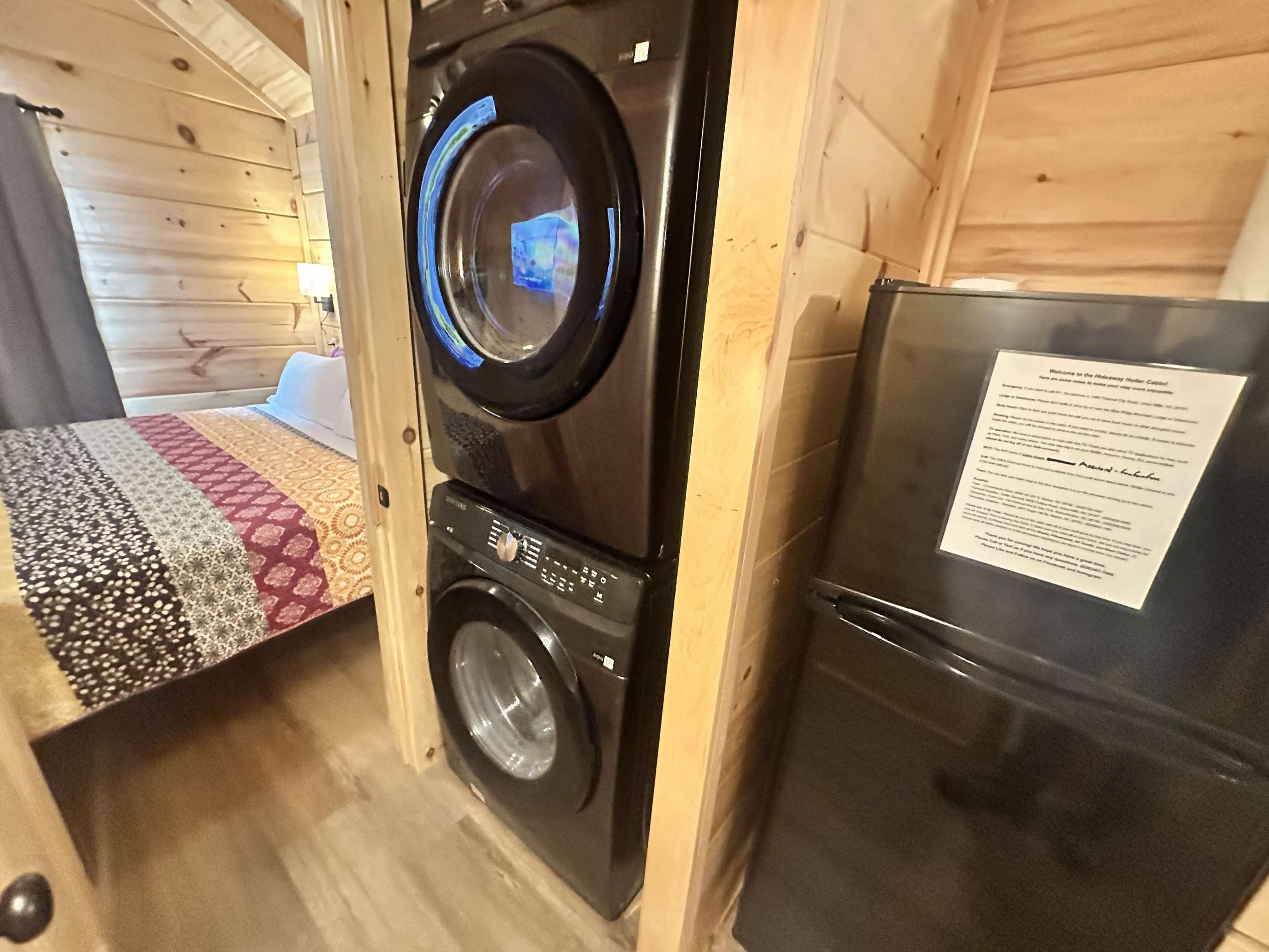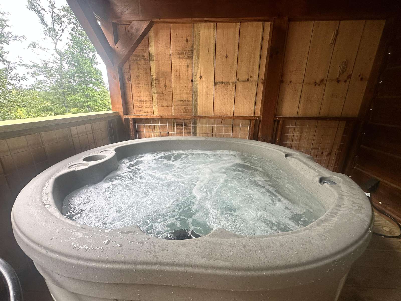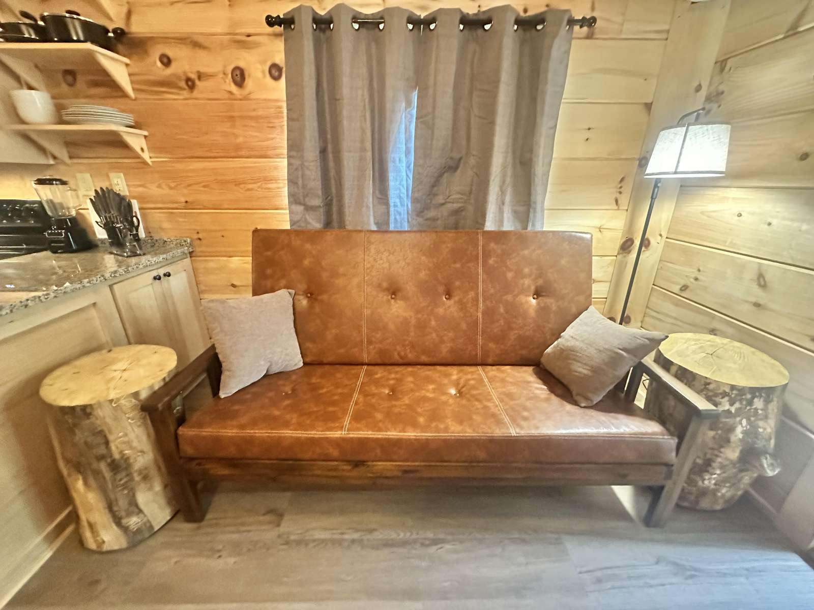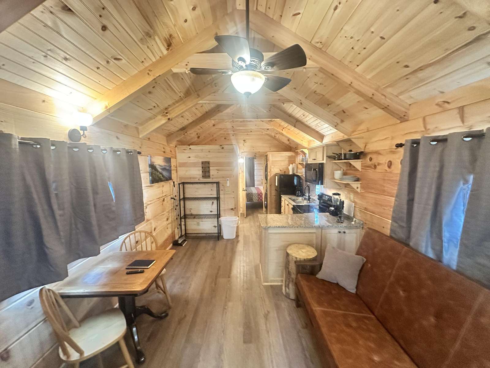 The Hideaway Holler cabin has log decor throughout. There is a futon in the living room along with end tables. The bedroom has a King bed with cotton quilt. Cell phone service is Great and the WiFi is super fast in this cabin. Most guest are able to use WiFi calling also while at these. The private, covered porch has a four person hot tub, gas grill, two rocking chairs, and a table. This cabin overlooks a pond in the winter time and has a wooded view in the summer time.. This cabin is pet friendly!!! The Hideaway Holler cabin is just perfect