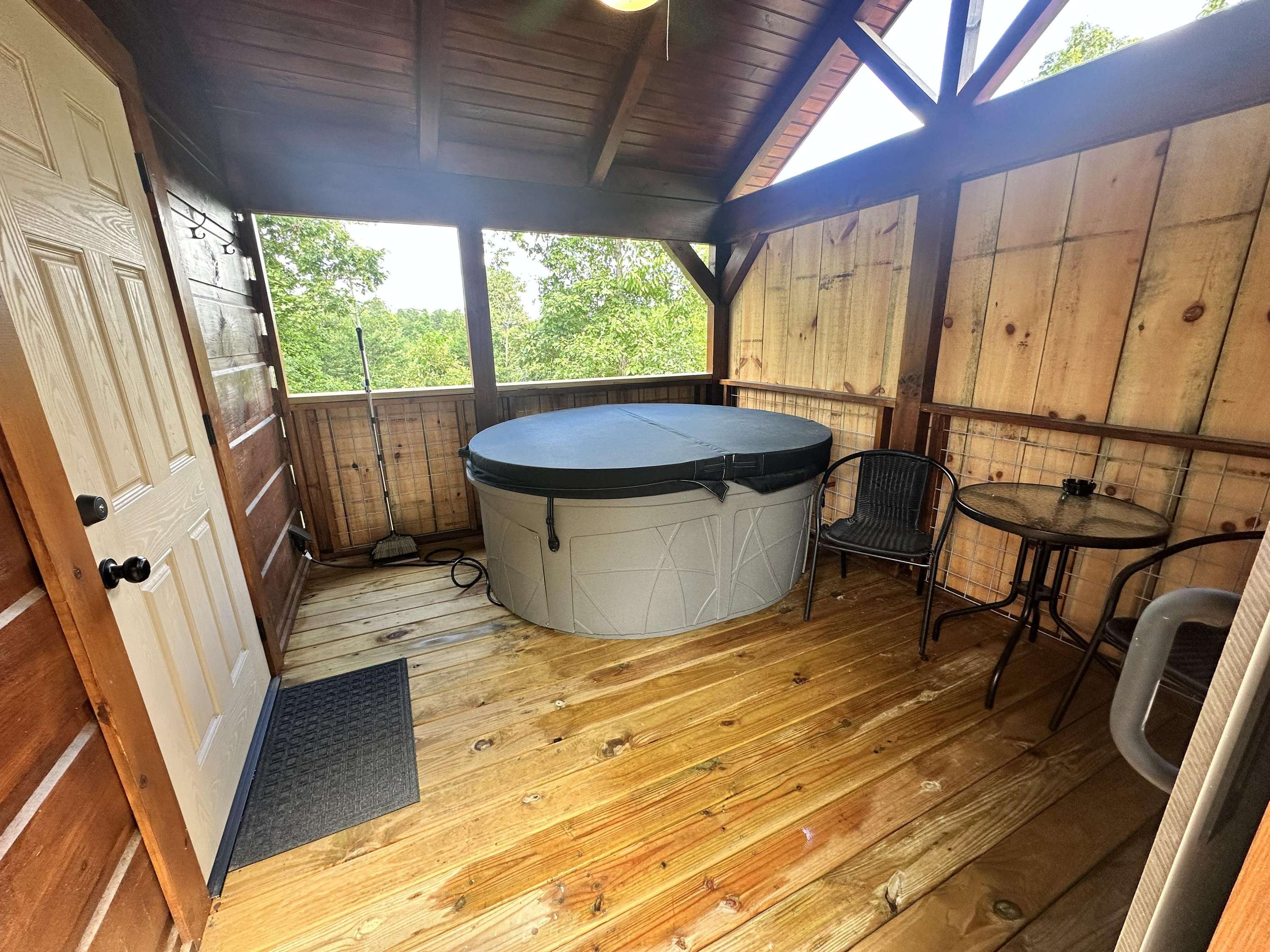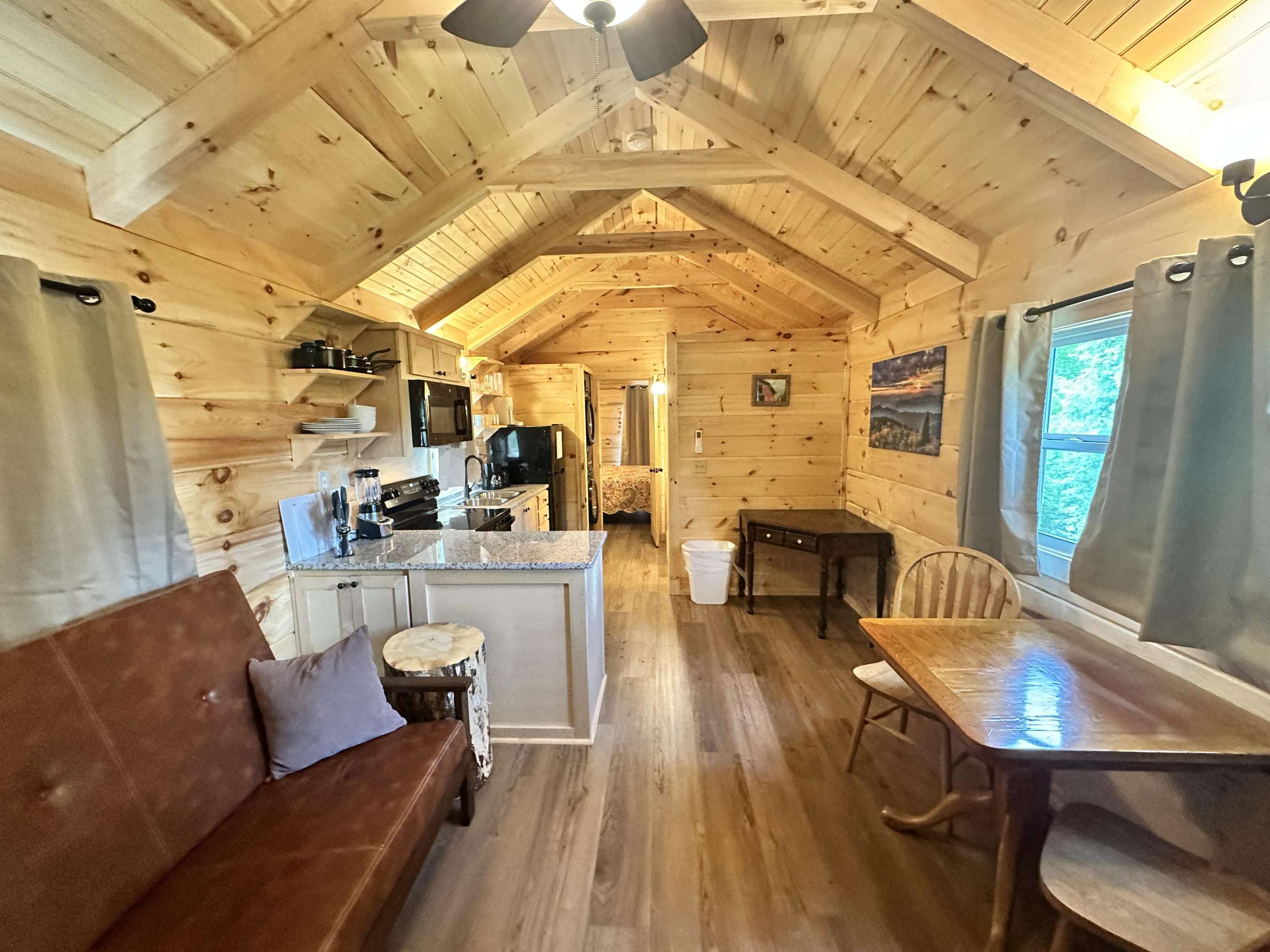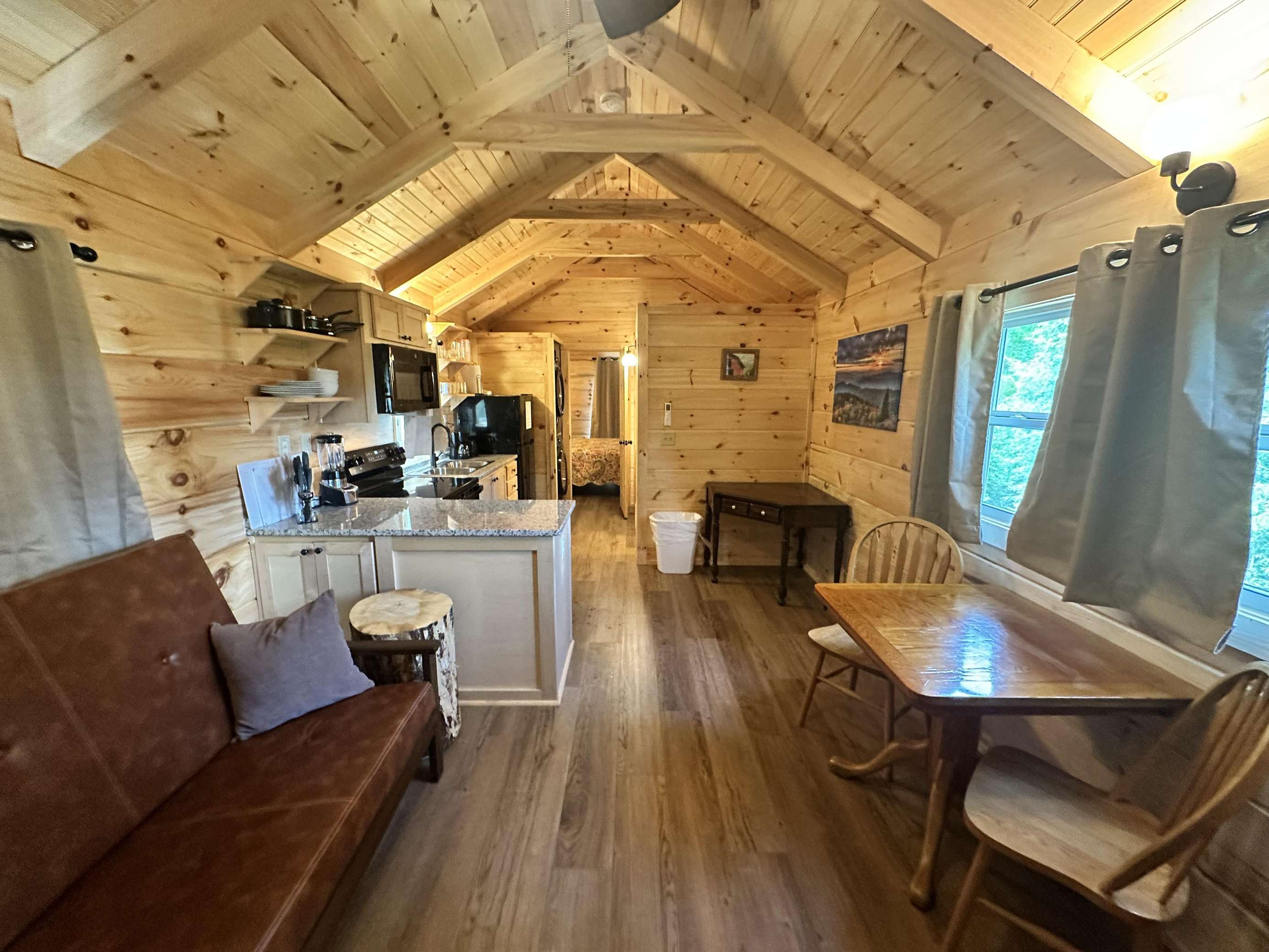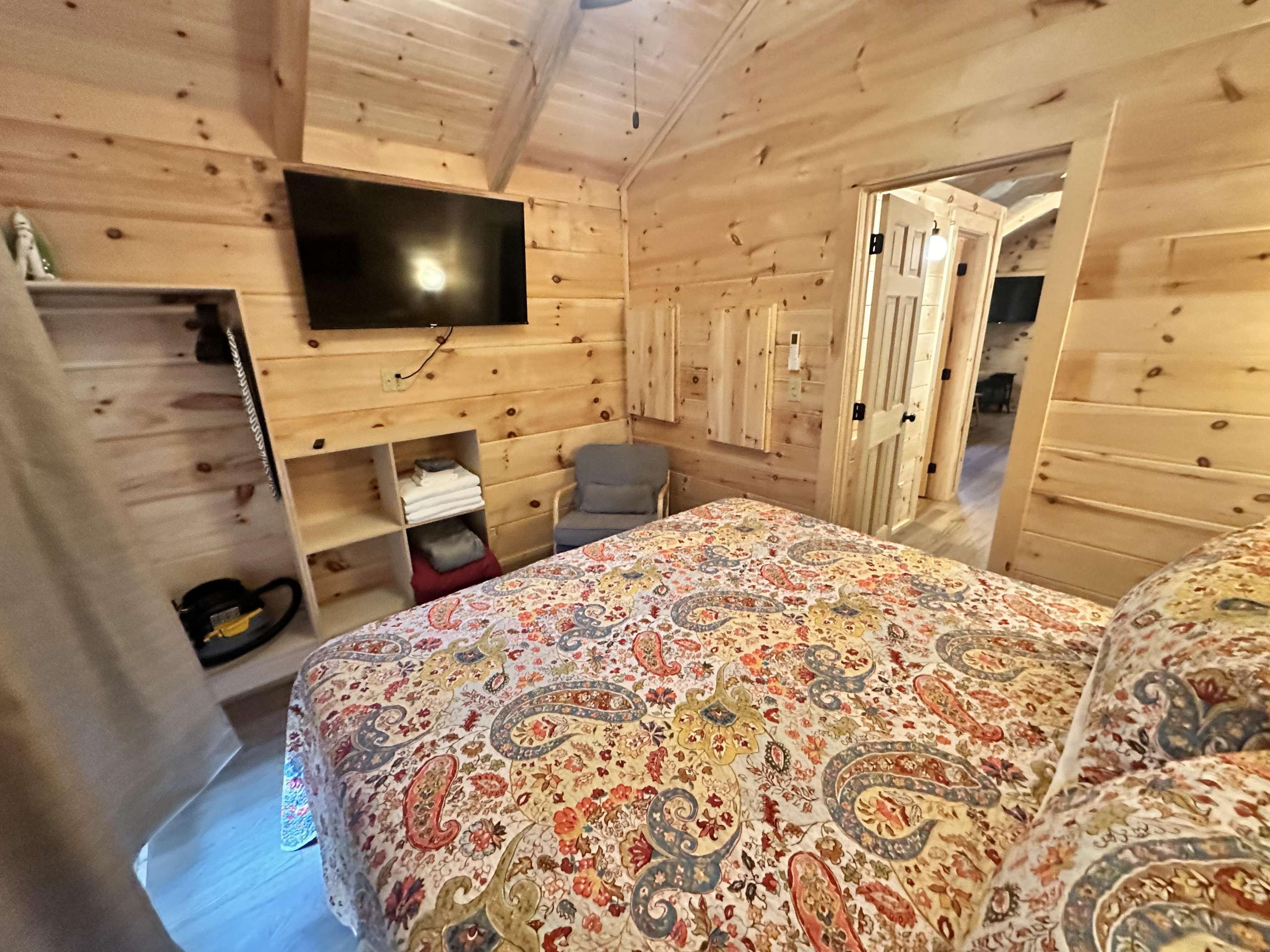 The Hunky Dory cabin features log decor, a living room couch and end tables. The bedroom has a king bed with a cotton quilt. Cell service is great, and WiFi is super fast; most guests can use WiFi calling. The private porch boasts a four-person hot tub, two chairs, and a table. It overlooks a pond in winter and a wooded view in summer. A charcoal grill is available; just bring the charcoal and steaks. This cabin is pet-friendly! The Hunky Dory cabin is just hunky-dory!