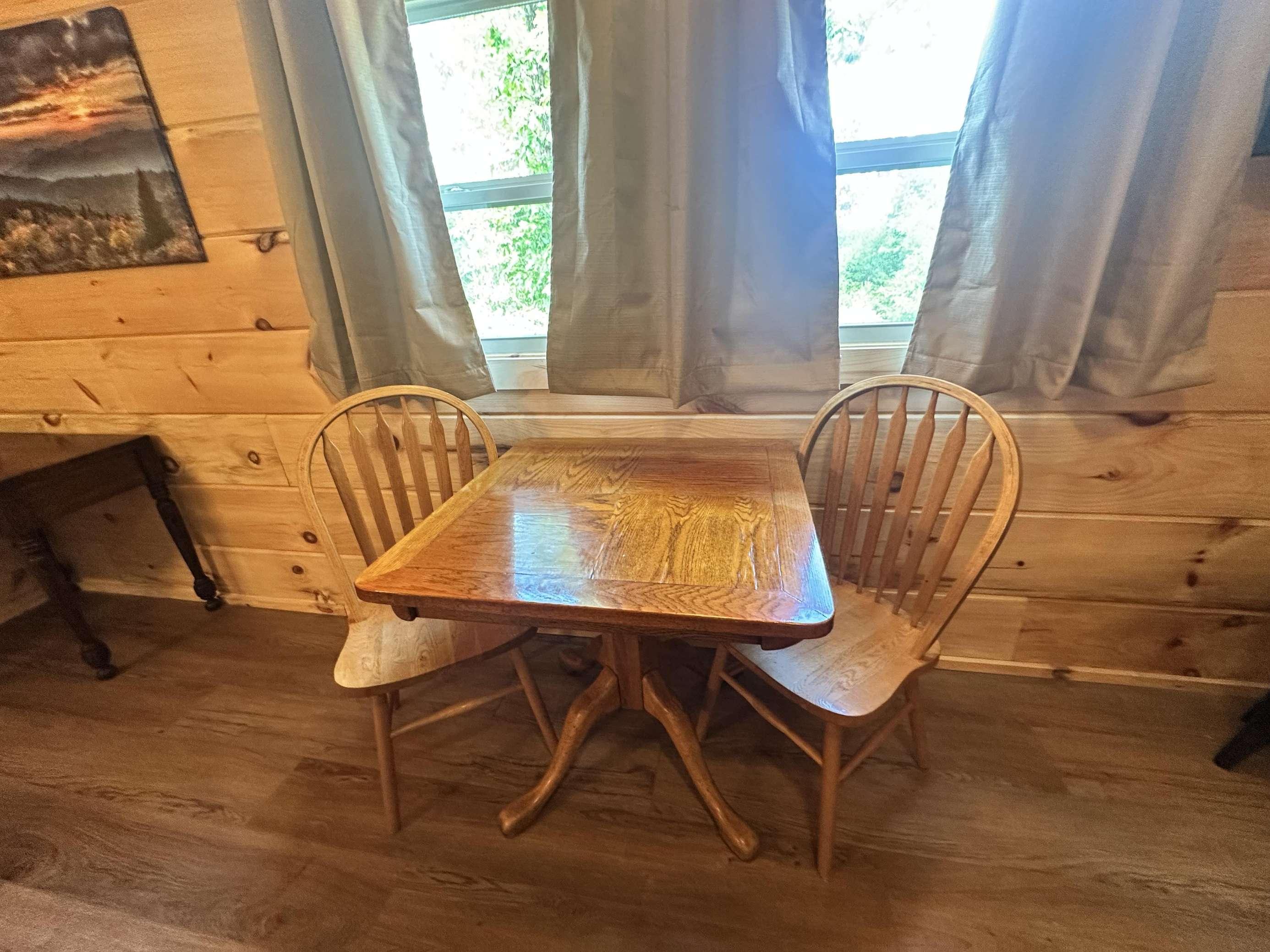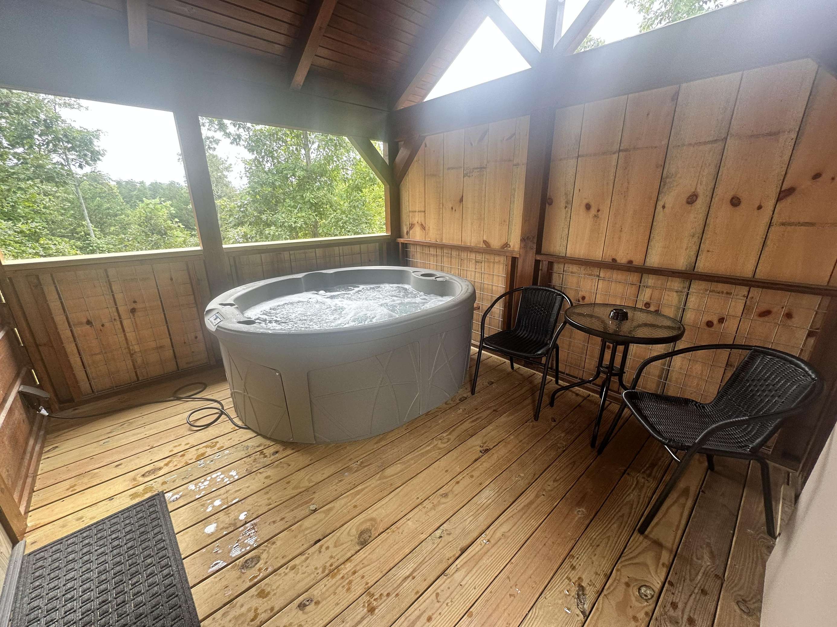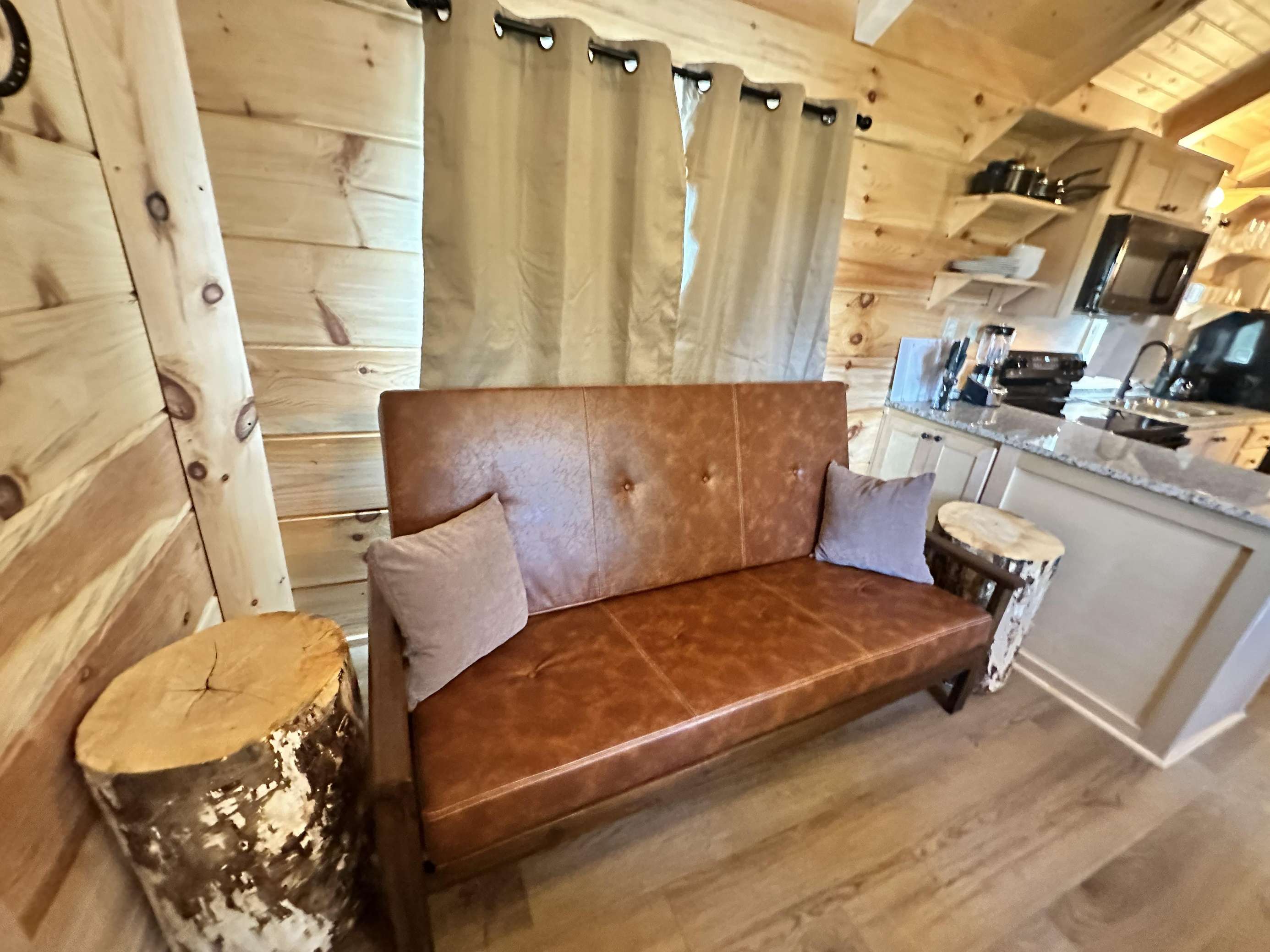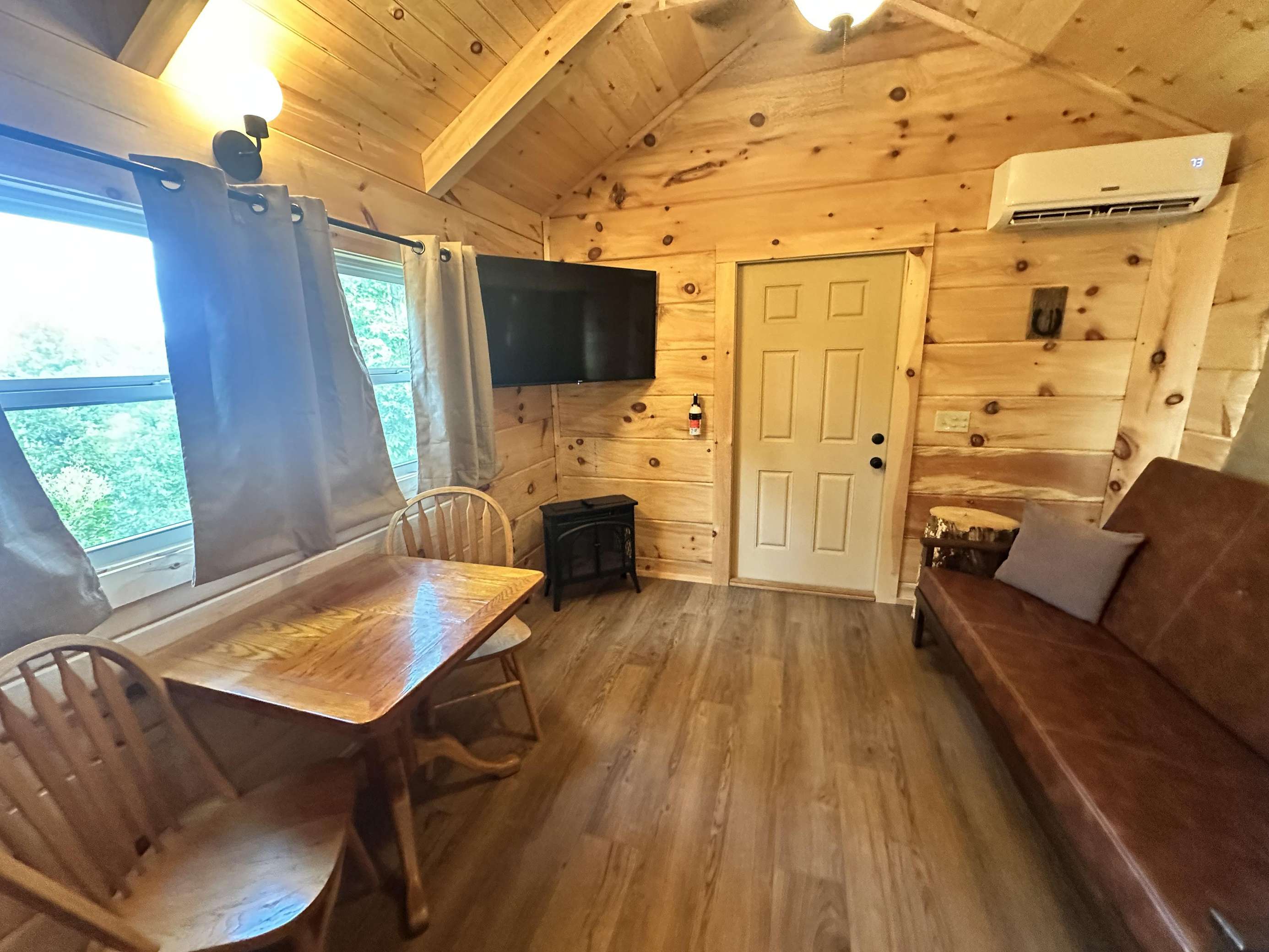 The Hunky Dory cabin features log decor, a living room couch and end tables. The bedroom has a king bed with a cotton quilt. Cell service is great, and WiFi is super fast; most guests can use WiFi calling. The private porch boasts a four-person hot tub, two chairs, and a table. It overlooks a pond in winter and a wooded view in summer. A charcoal grill is available; just bring the charcoal and steaks. This cabin is pet-friendly! The Hunky Dory cabin is just hunky-dory!