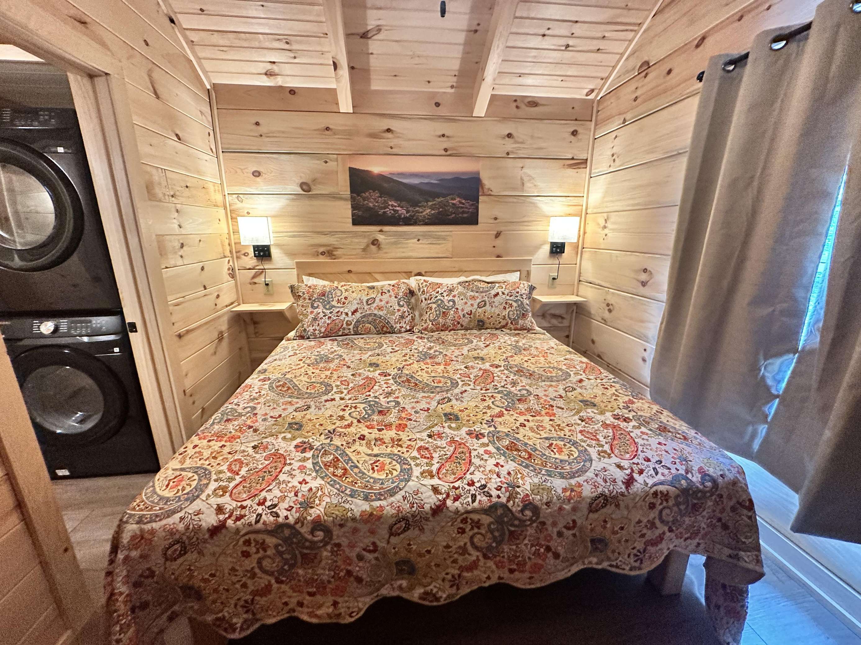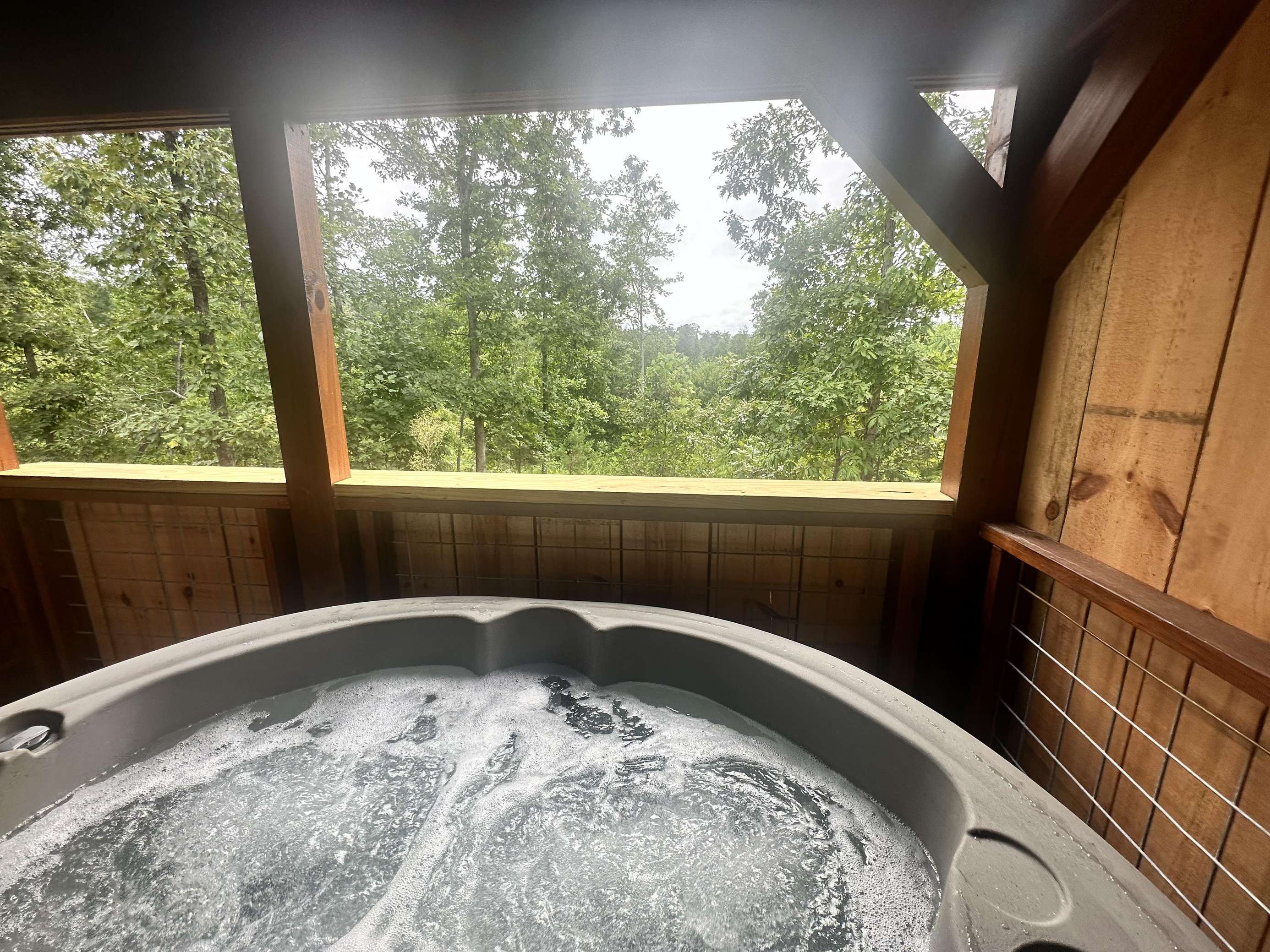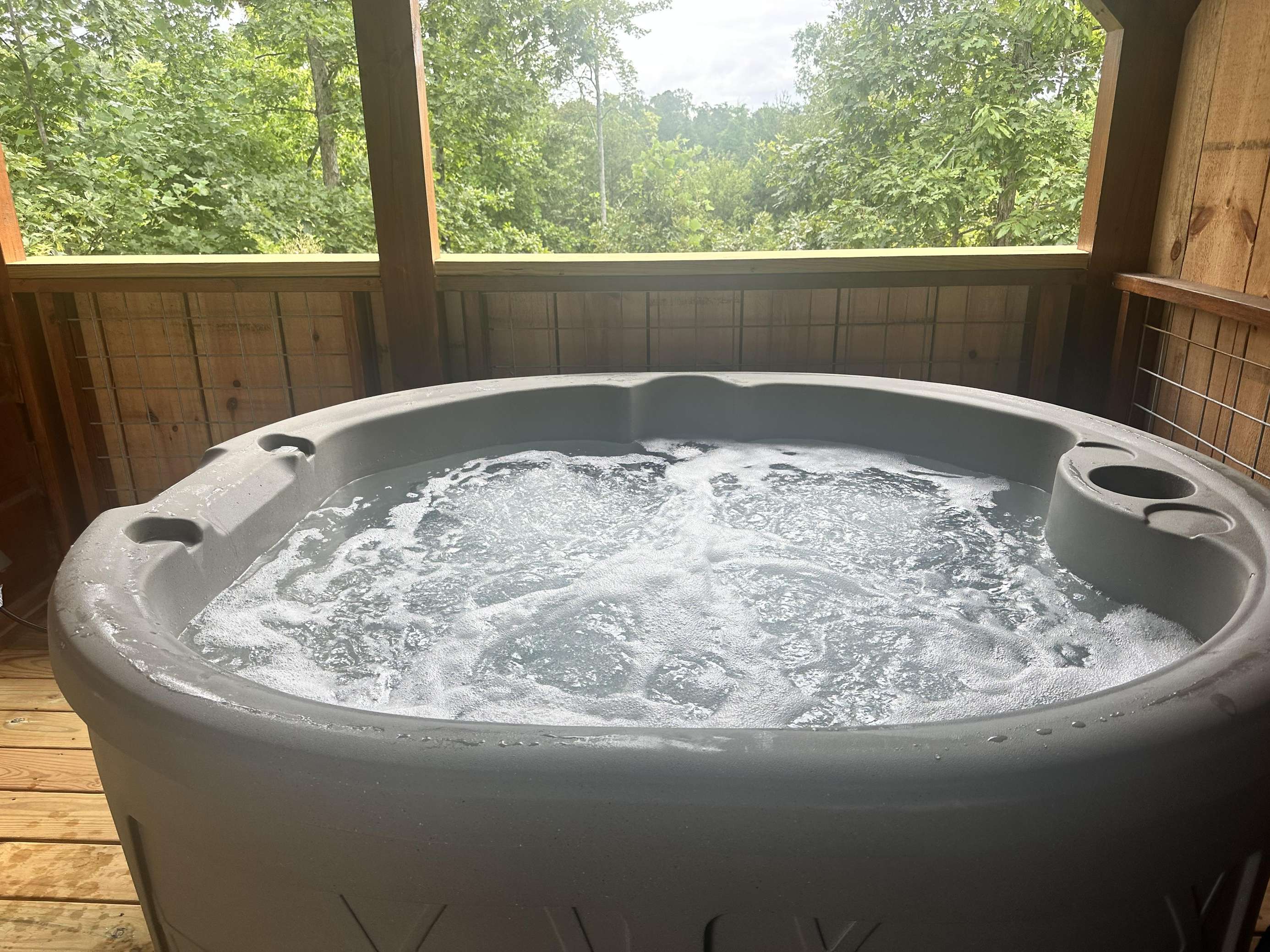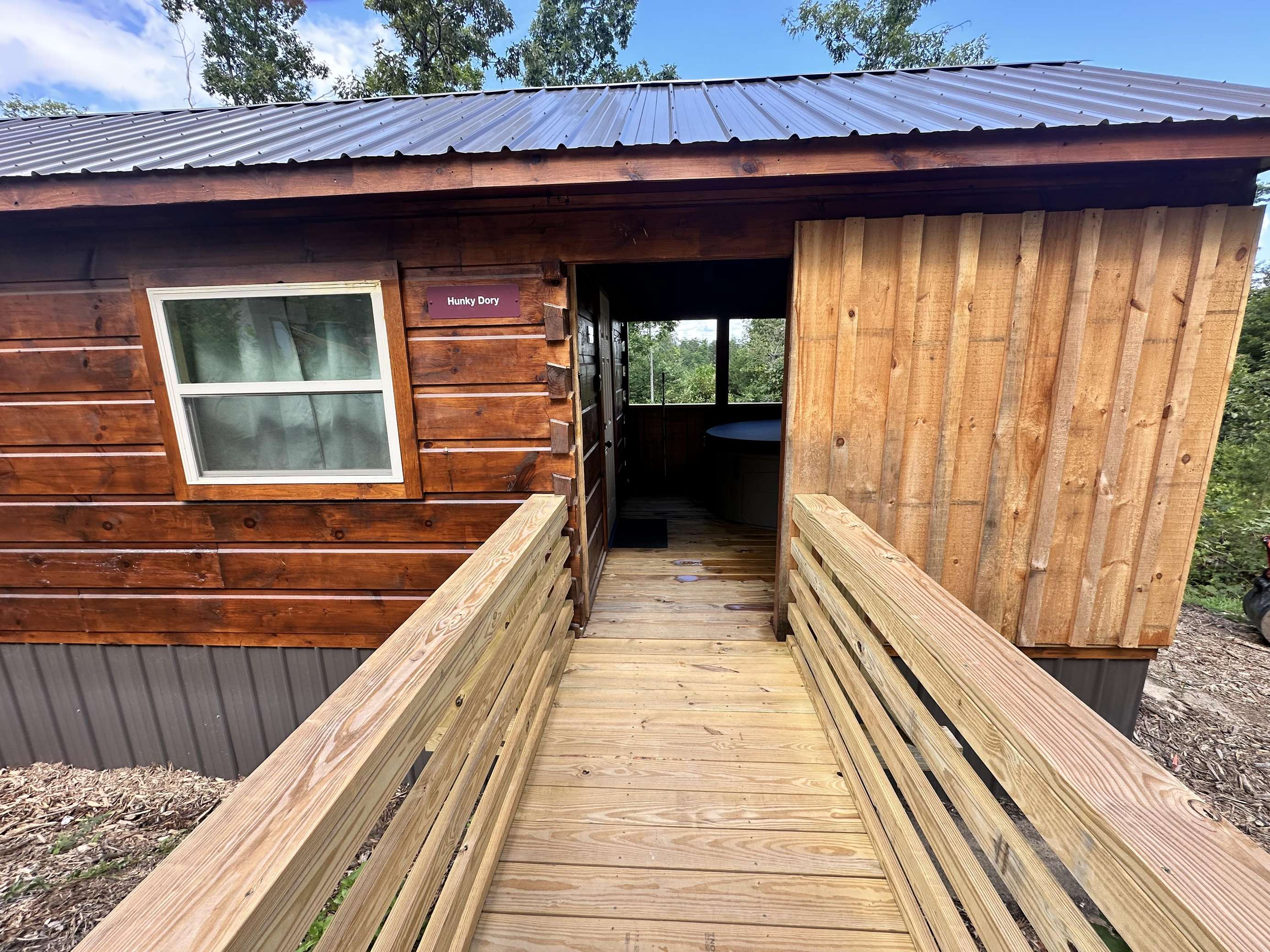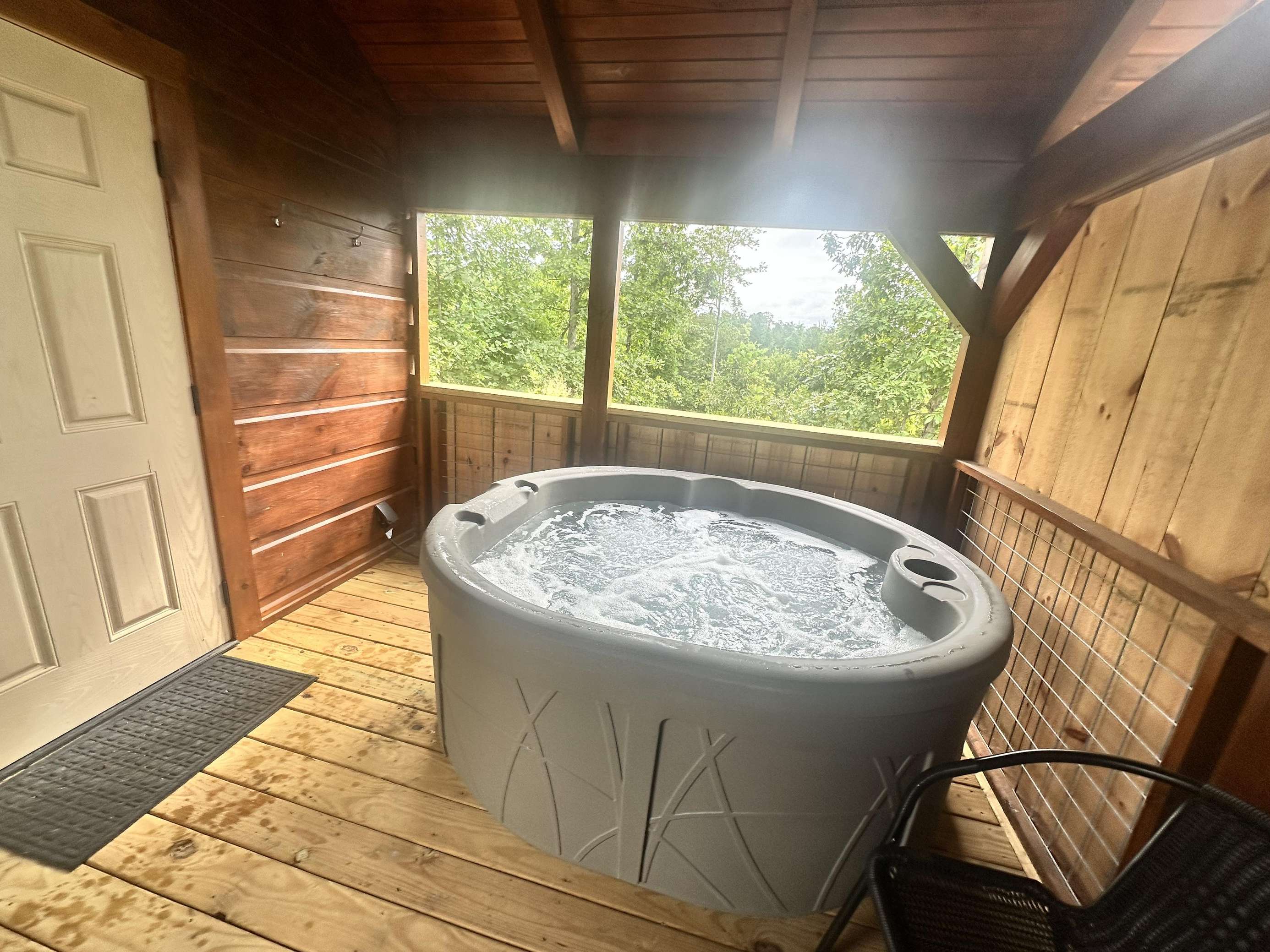 The Hunky Dory cabin features log decor, a living room couch and end tables. The bedroom has a king bed with a cotton quilt. Cell service is great, and WiFi is super fast; most guests can use WiFi calling. The private porch boasts a four-person hot tub, two chairs, and a table. It overlooks a pond in winter and a wooded view in summer. A charcoal grill is available; just bring the charcoal and steaks. This cabin is pet-friendly! The Hunky Dory cabin is just hunky-dory!