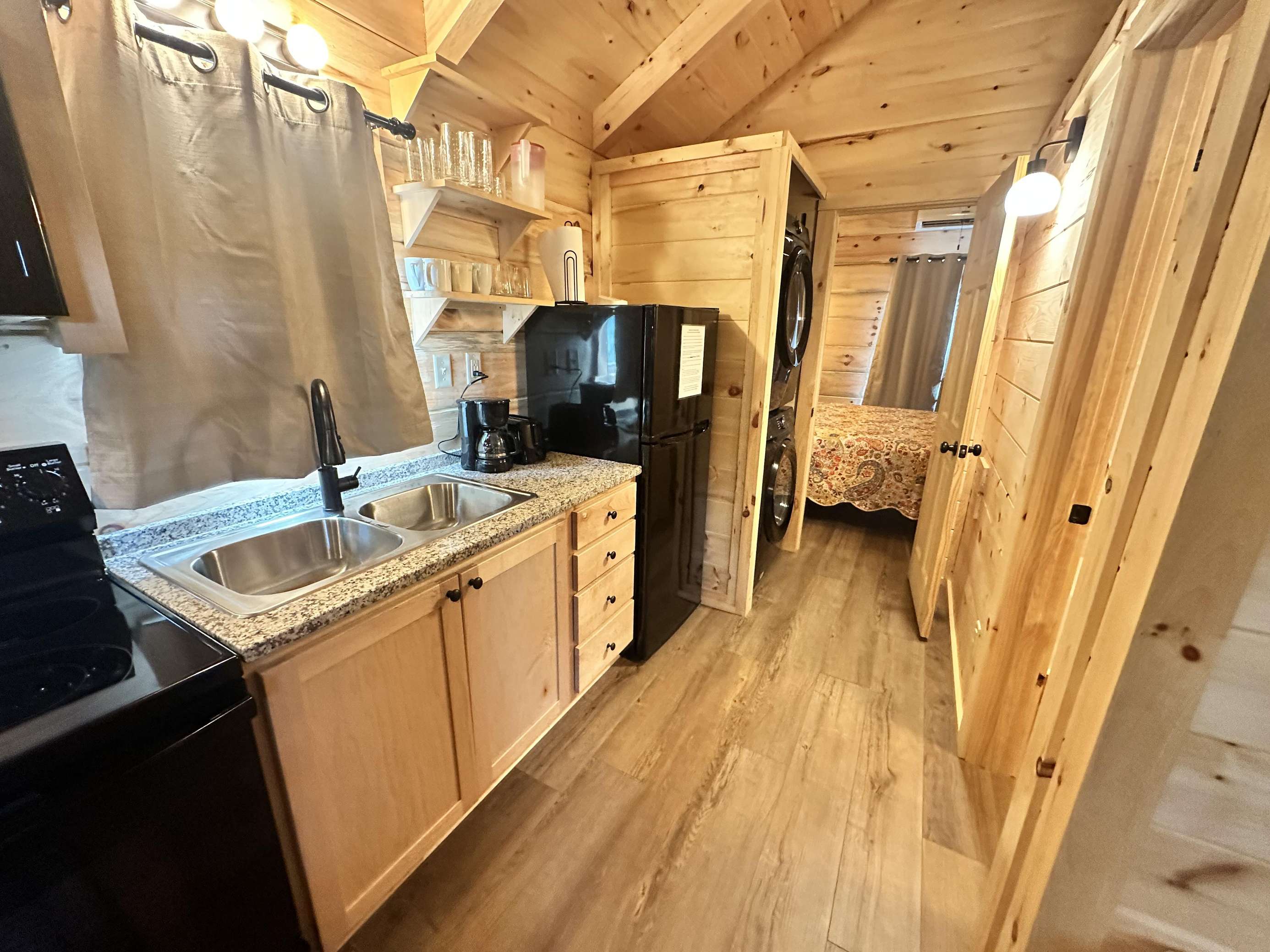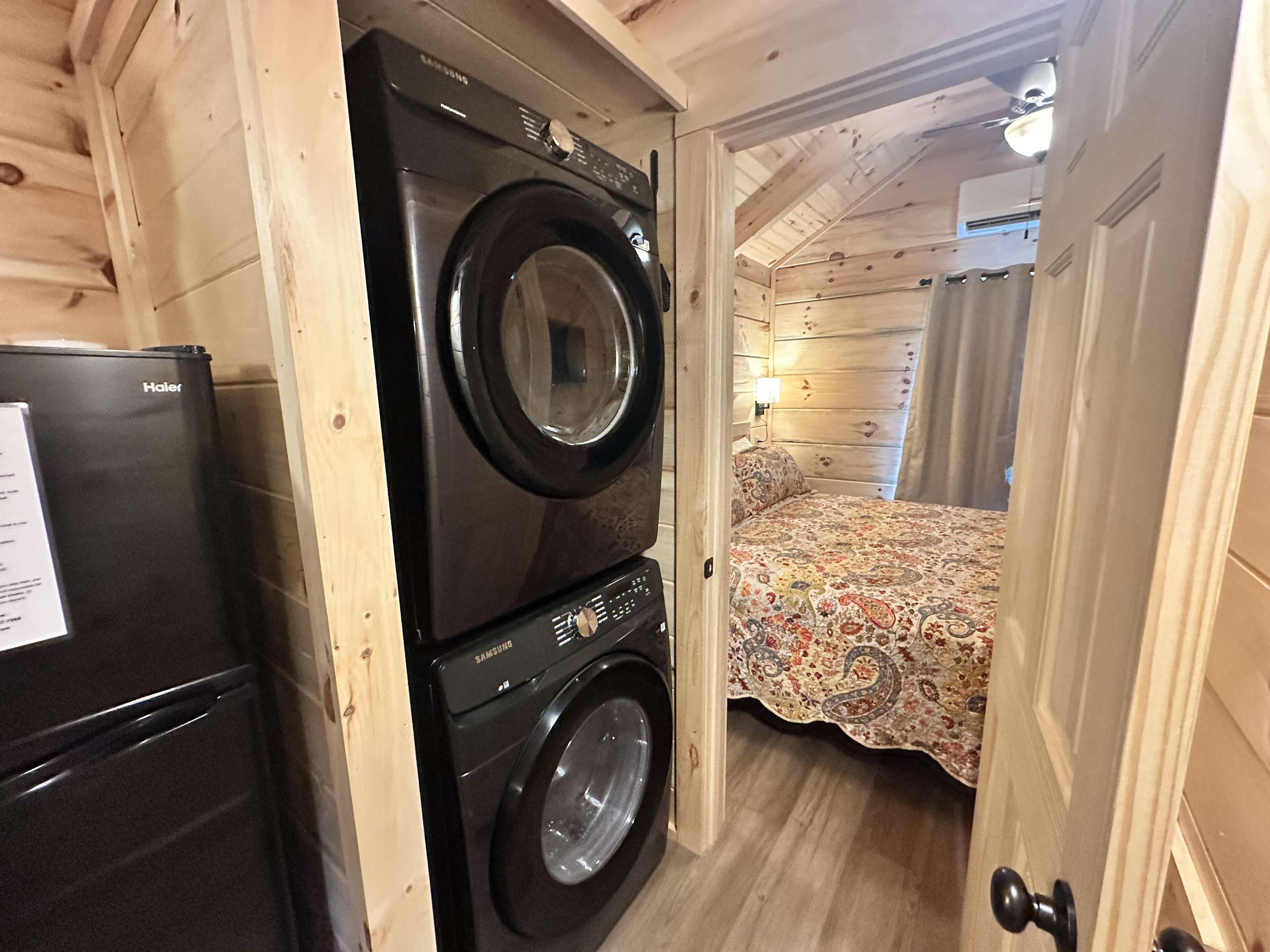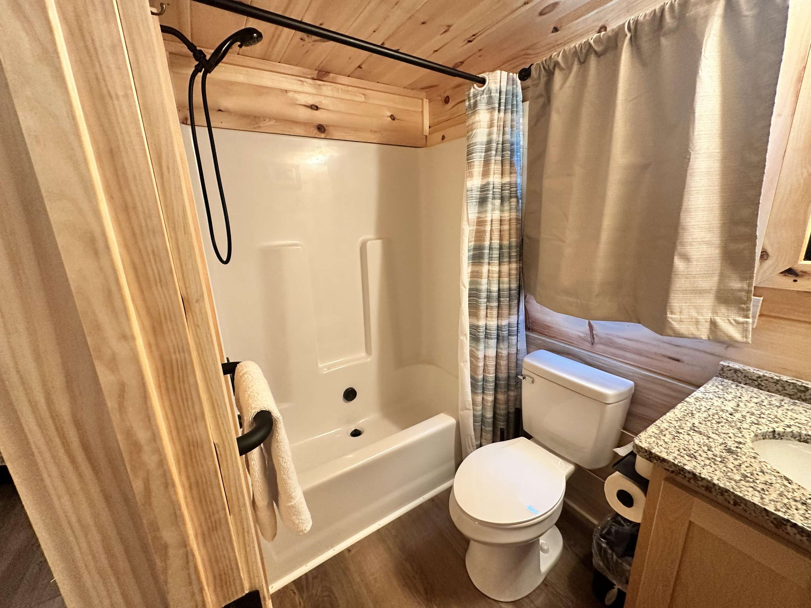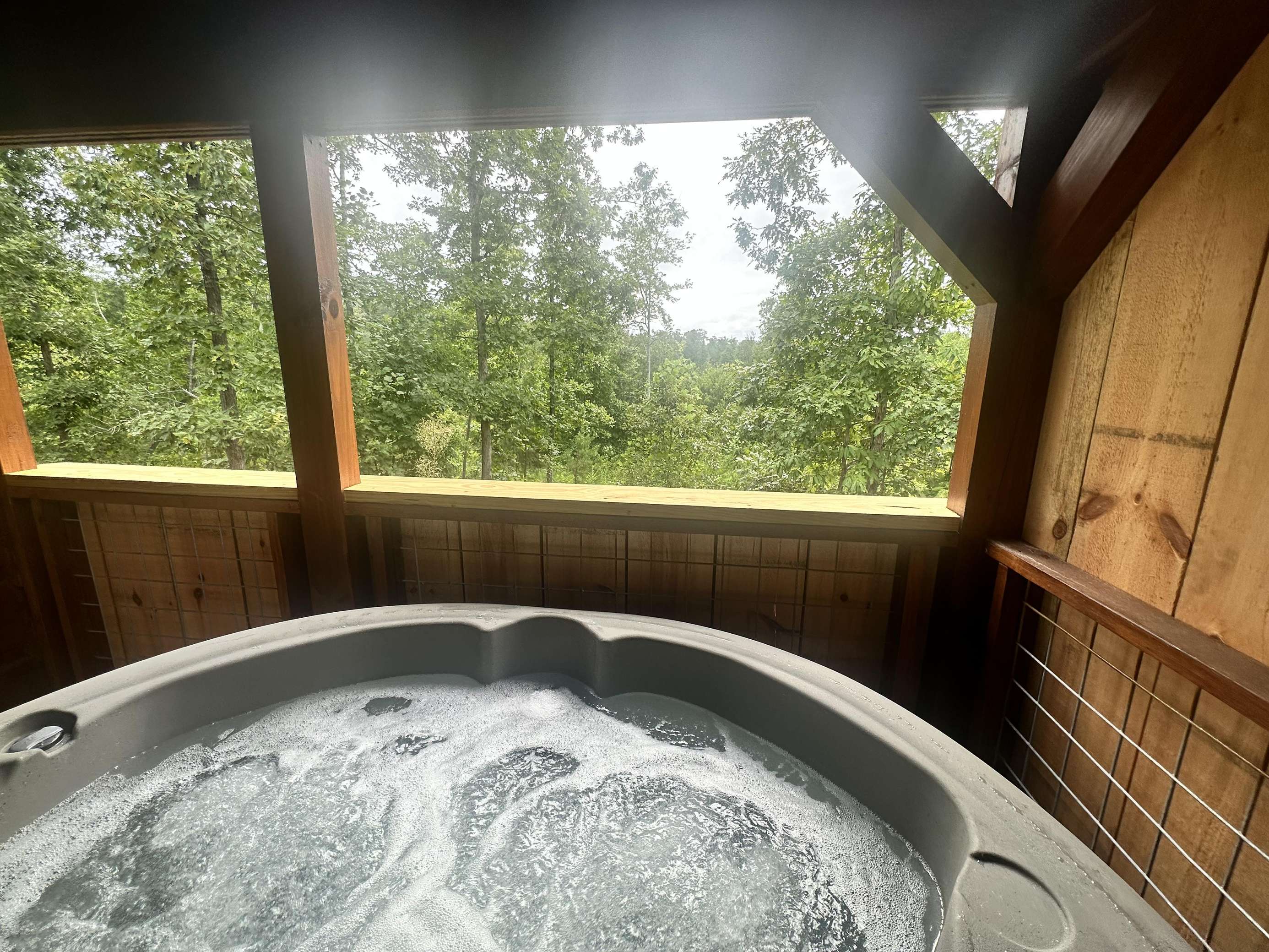 The Hunky Dory cabin features log decor, a living room couch and end tables. The bedroom has a king bed with a cotton quilt. Cell service is great, and WiFi is super fast; most guests can use WiFi calling. The private porch boasts a four-person hot tub, two chairs, and a table. It overlooks a pond in winter and a wooded view in summer. A charcoal grill is available; just bring the charcoal and steaks. This cabin is pet-friendly! The Hunky Dory cabin is just hunky-dory!