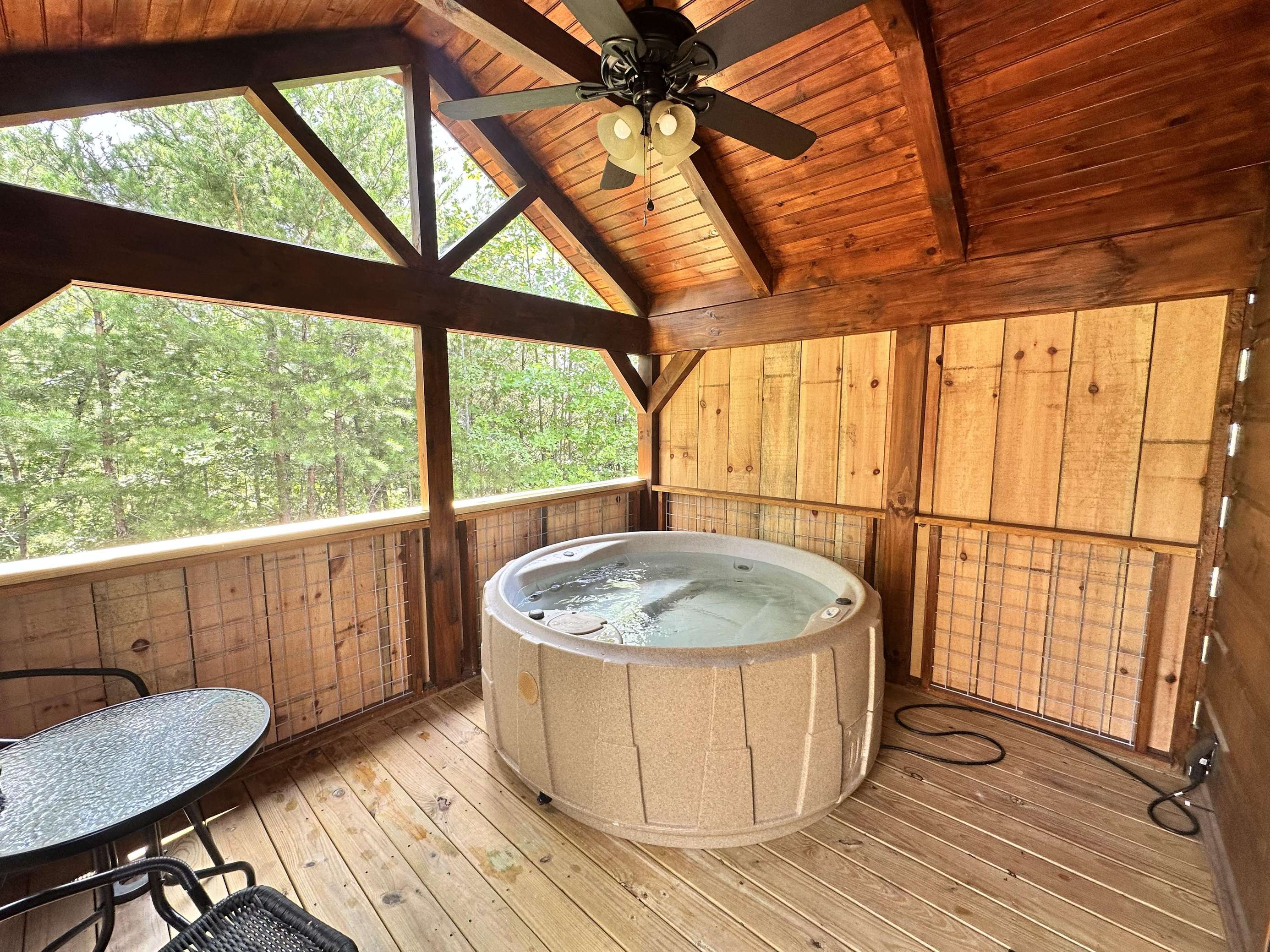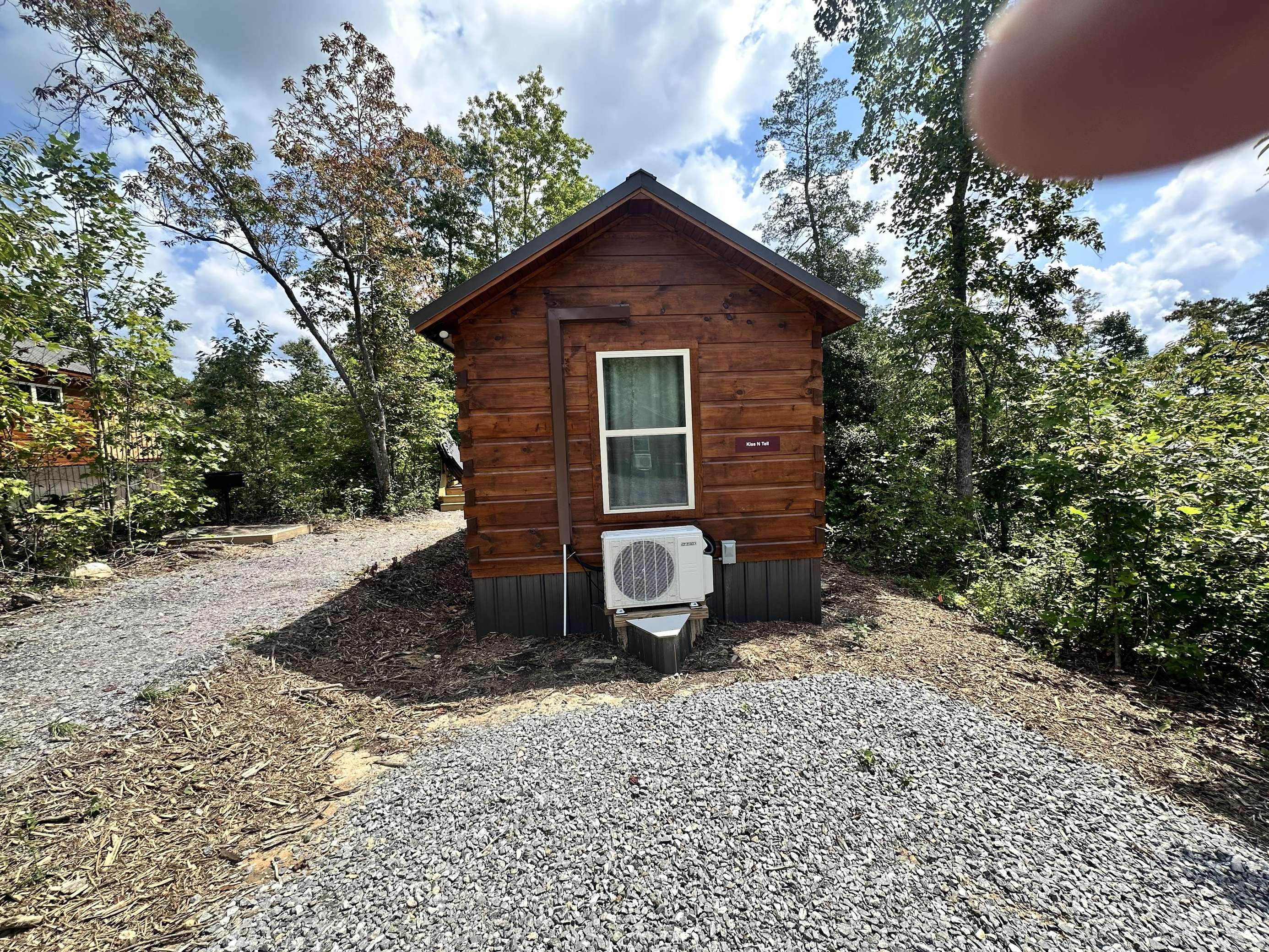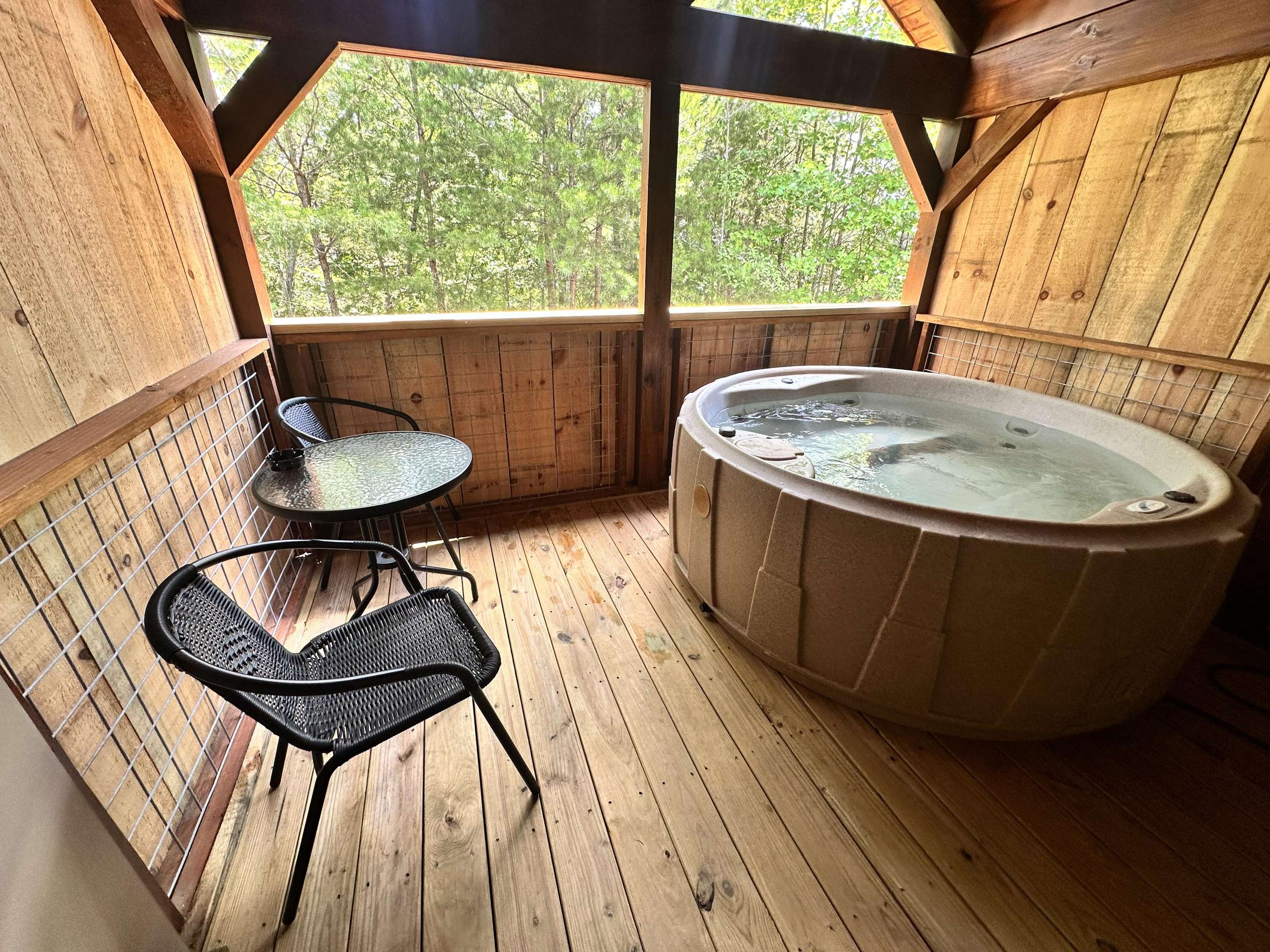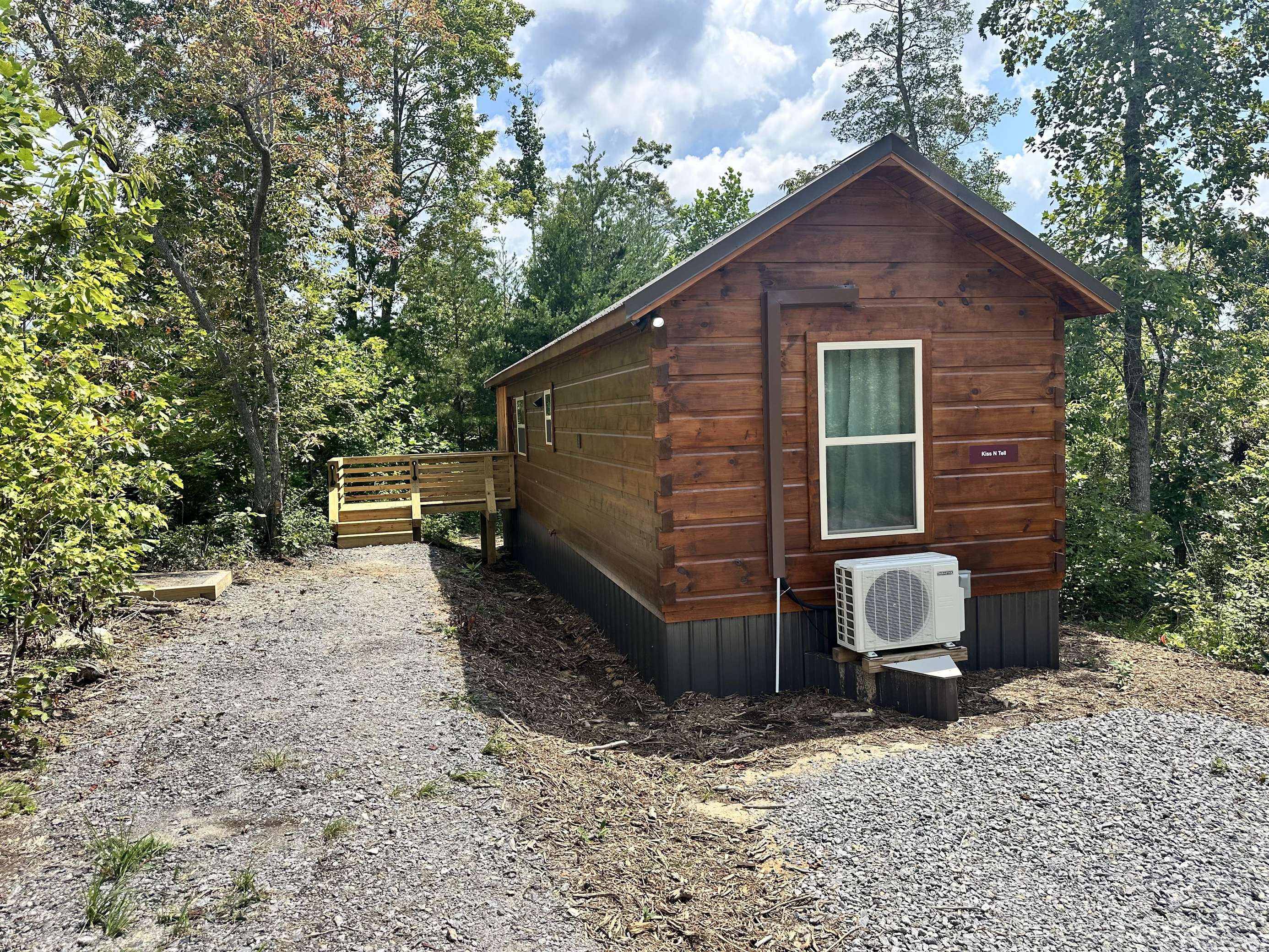 The Kiss N Tell cabin has log decor throughout. There is a couch in the living room along with a coffee table. The bedroom has a King bed with cotton quilt. Cell phone service is Great and the WiFi is super fast in this cabin. Most guest are able to use WiFi calling also while at these. There is a charcoal grill outside. The private, covered porch has a hot tub, two chairs, and a table. This cabin overlooks a meadow in the winter time and has a wooded view in the summer time.. This cabin is pet friendly!!! The Kiss N Tell cabin is just perfect