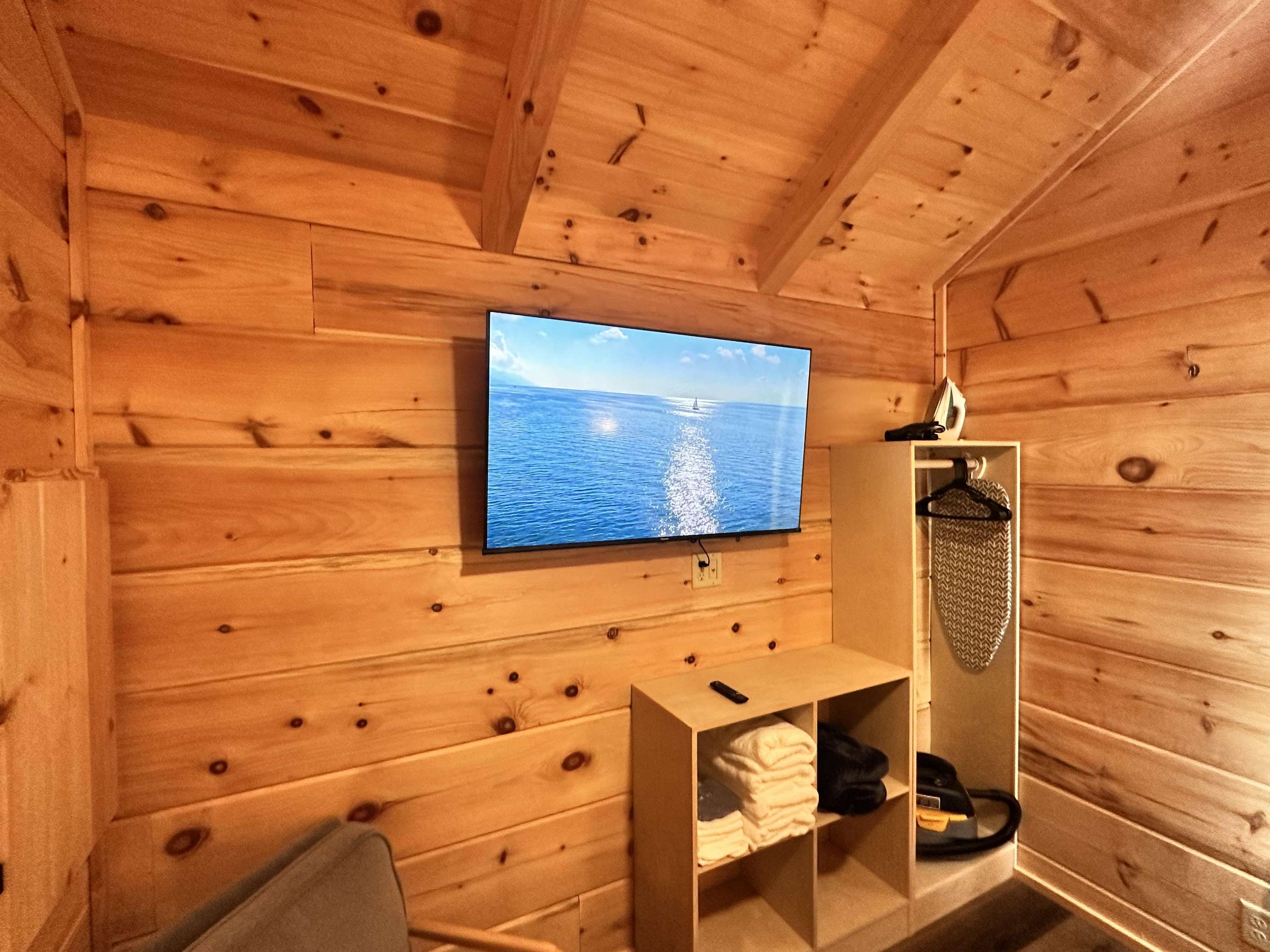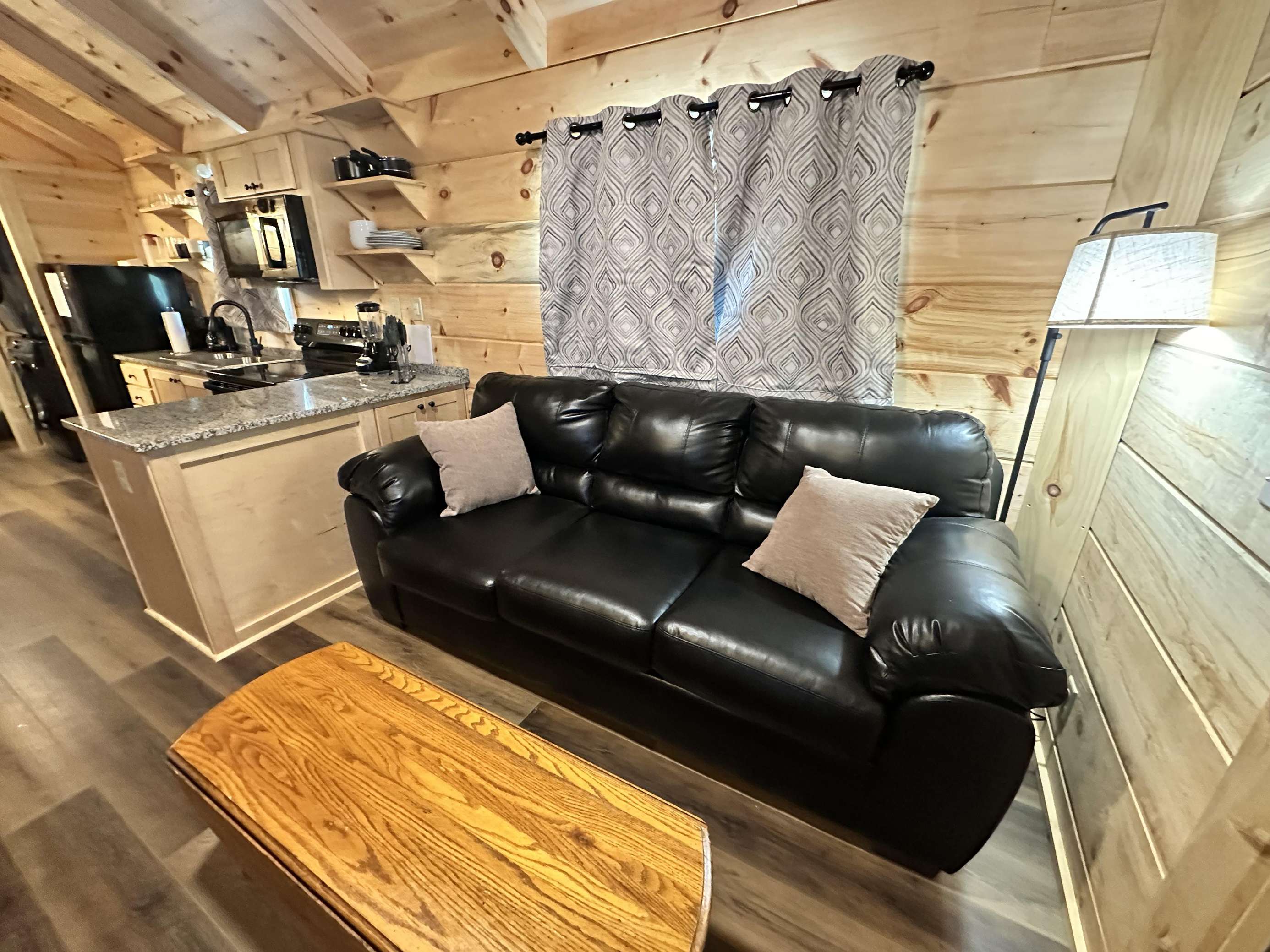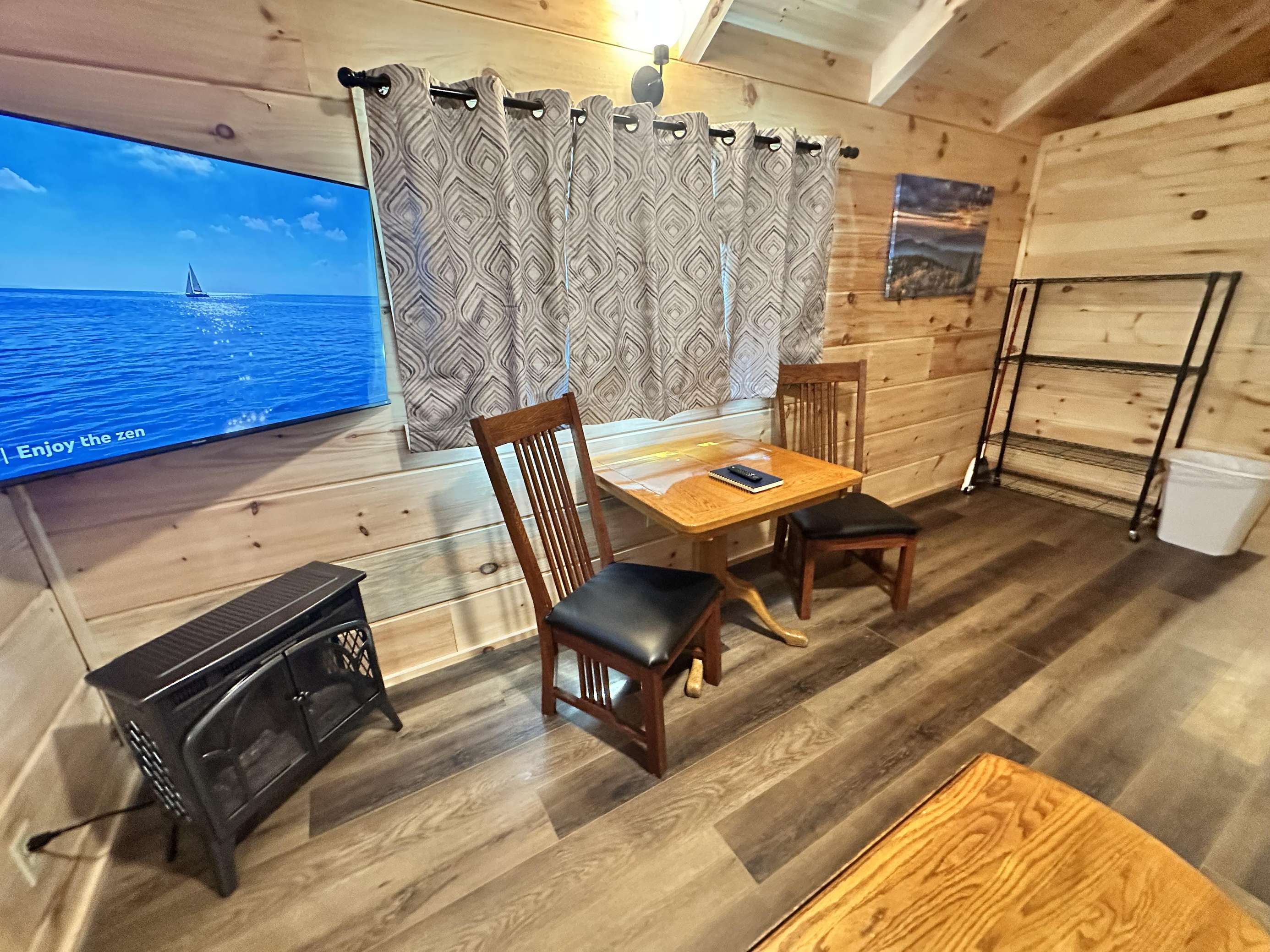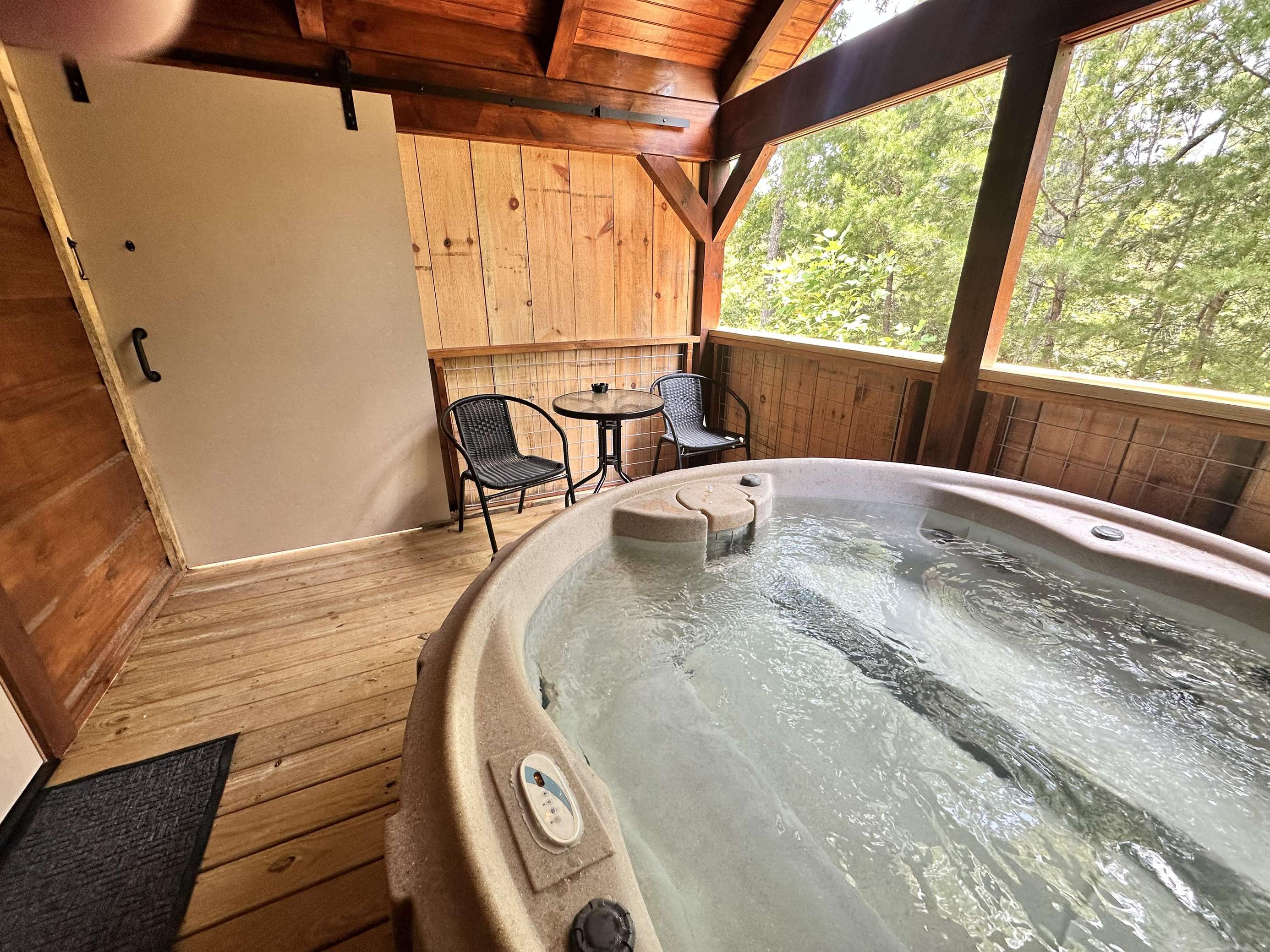 The Kiss N Tell cabin has log decor throughout. There is a couch in the living room along with a coffee table. The bedroom has a King bed with cotton quilt. Cell phone service is Great and the WiFi is super fast in this cabin. Most guest are able to use WiFi calling also while at these. There is a charcoal grill outside. The private, covered porch has a hot tub, two chairs, and a table. This cabin overlooks a meadow in the winter time and has a wooded view in the summer time.. This cabin is pet friendly!!! The Kiss N Tell cabin is just perfect