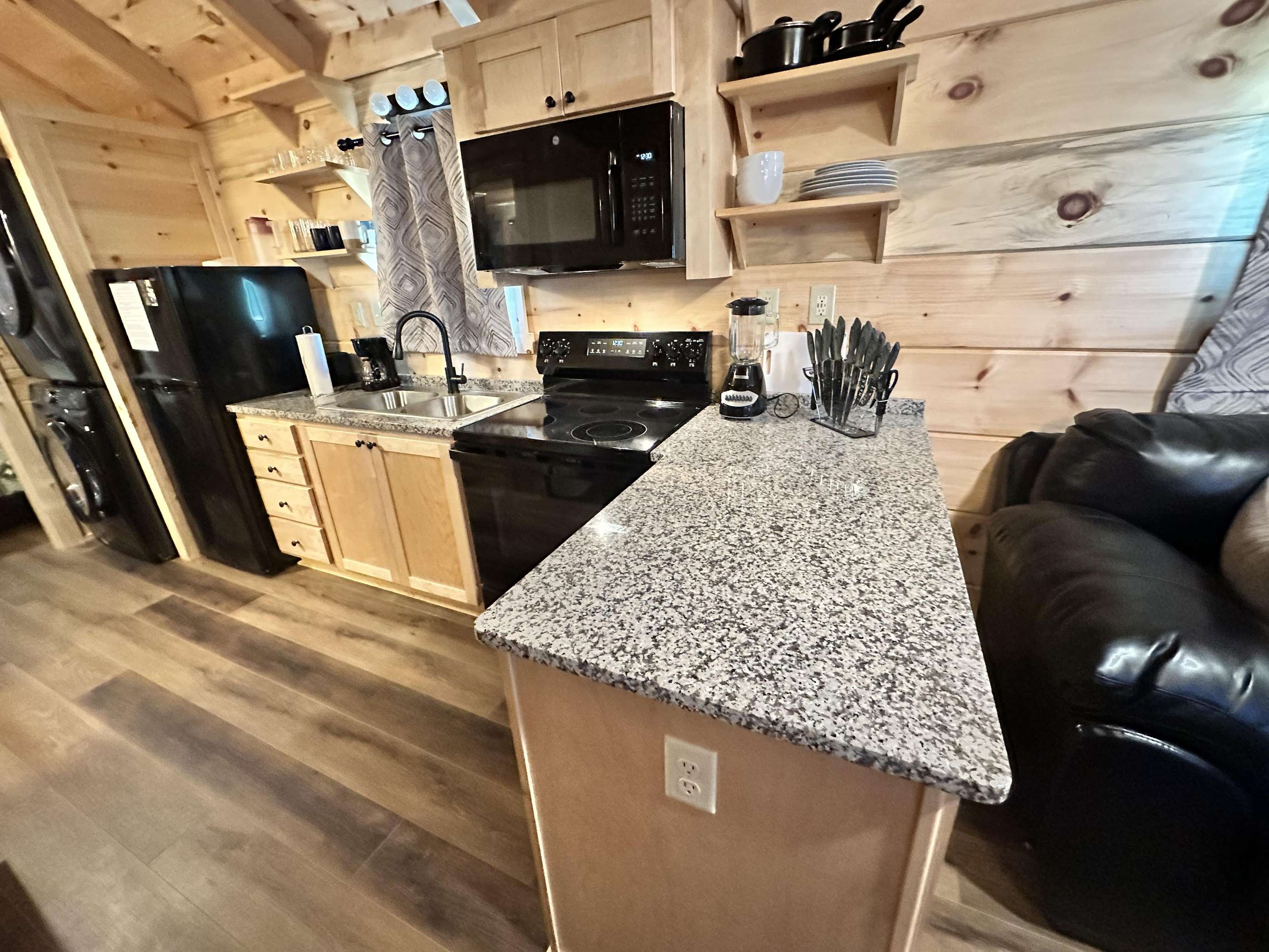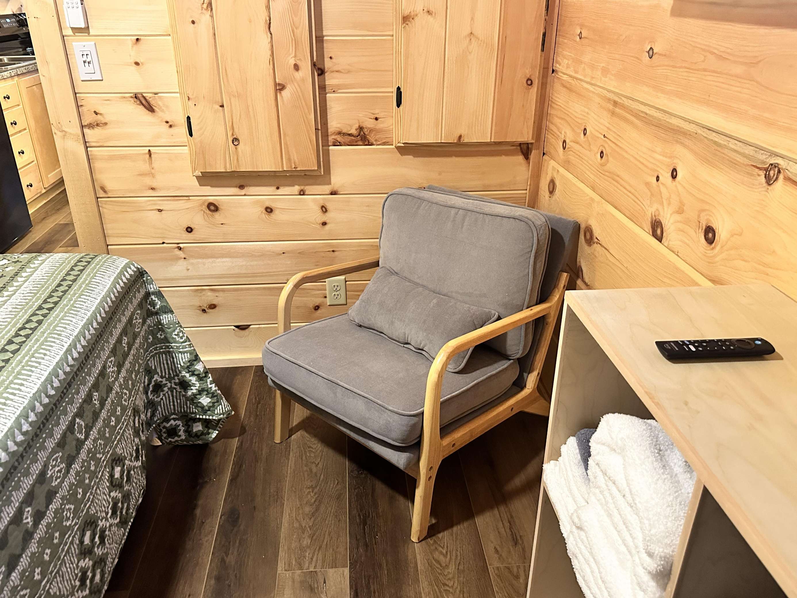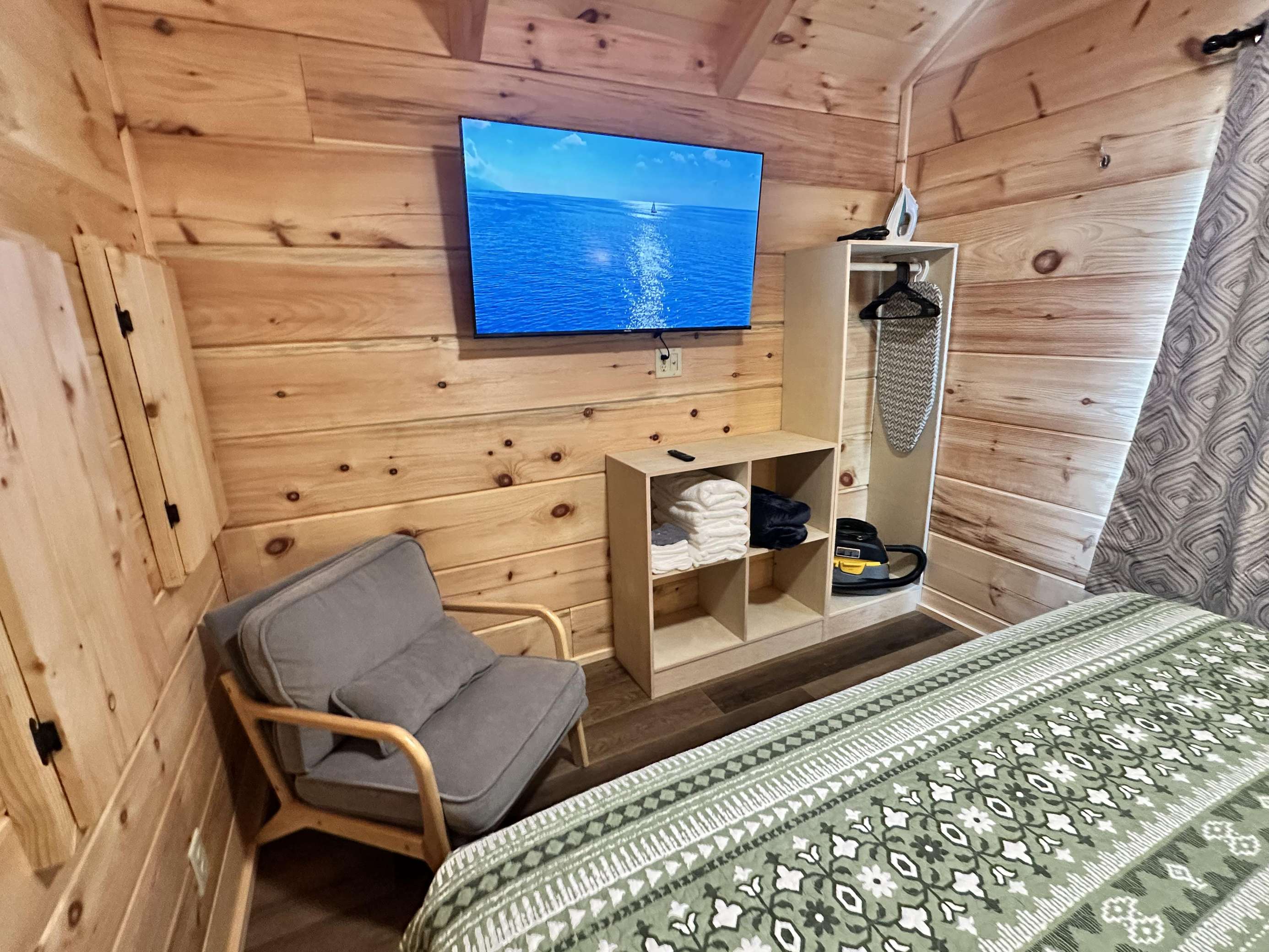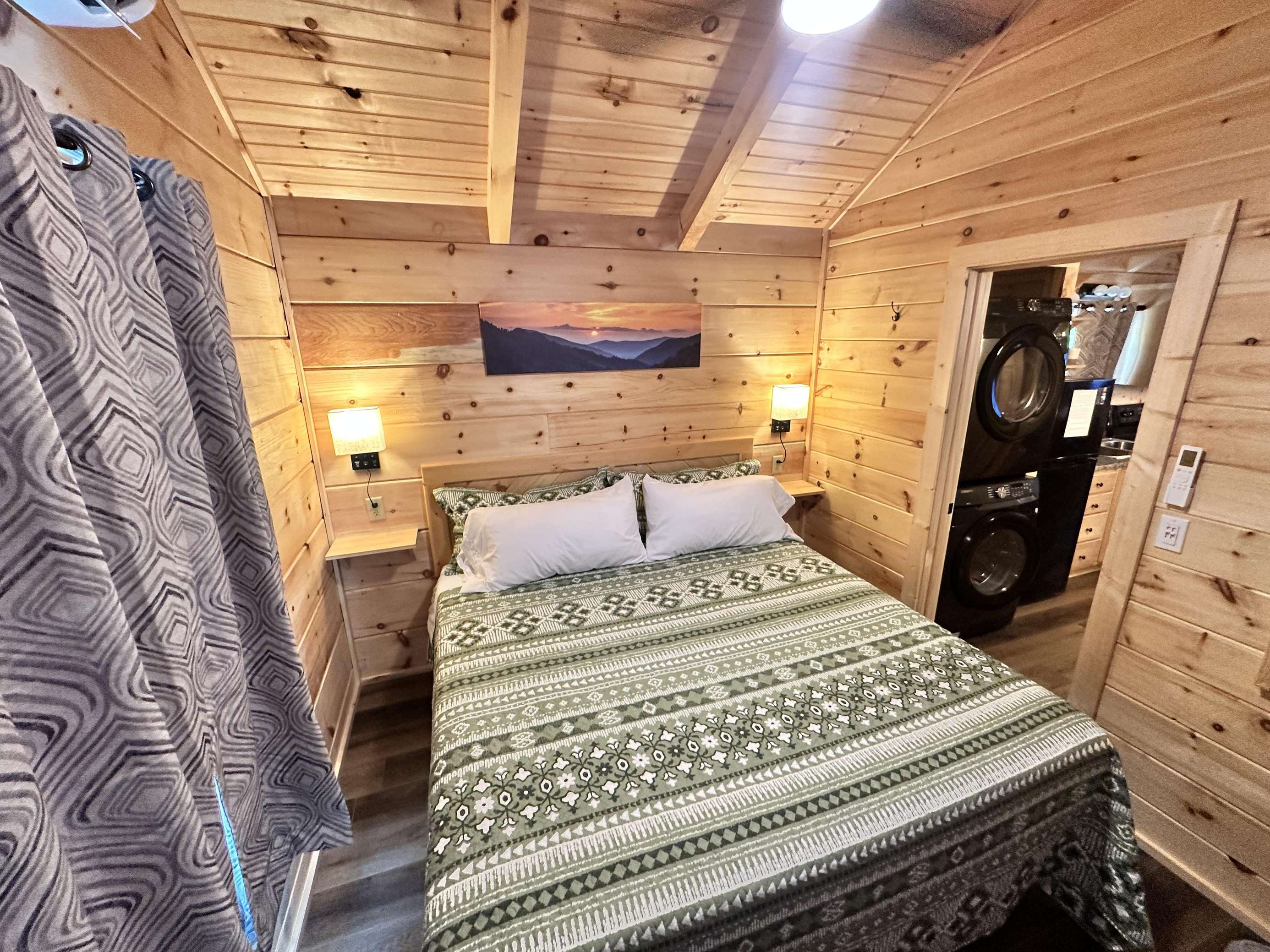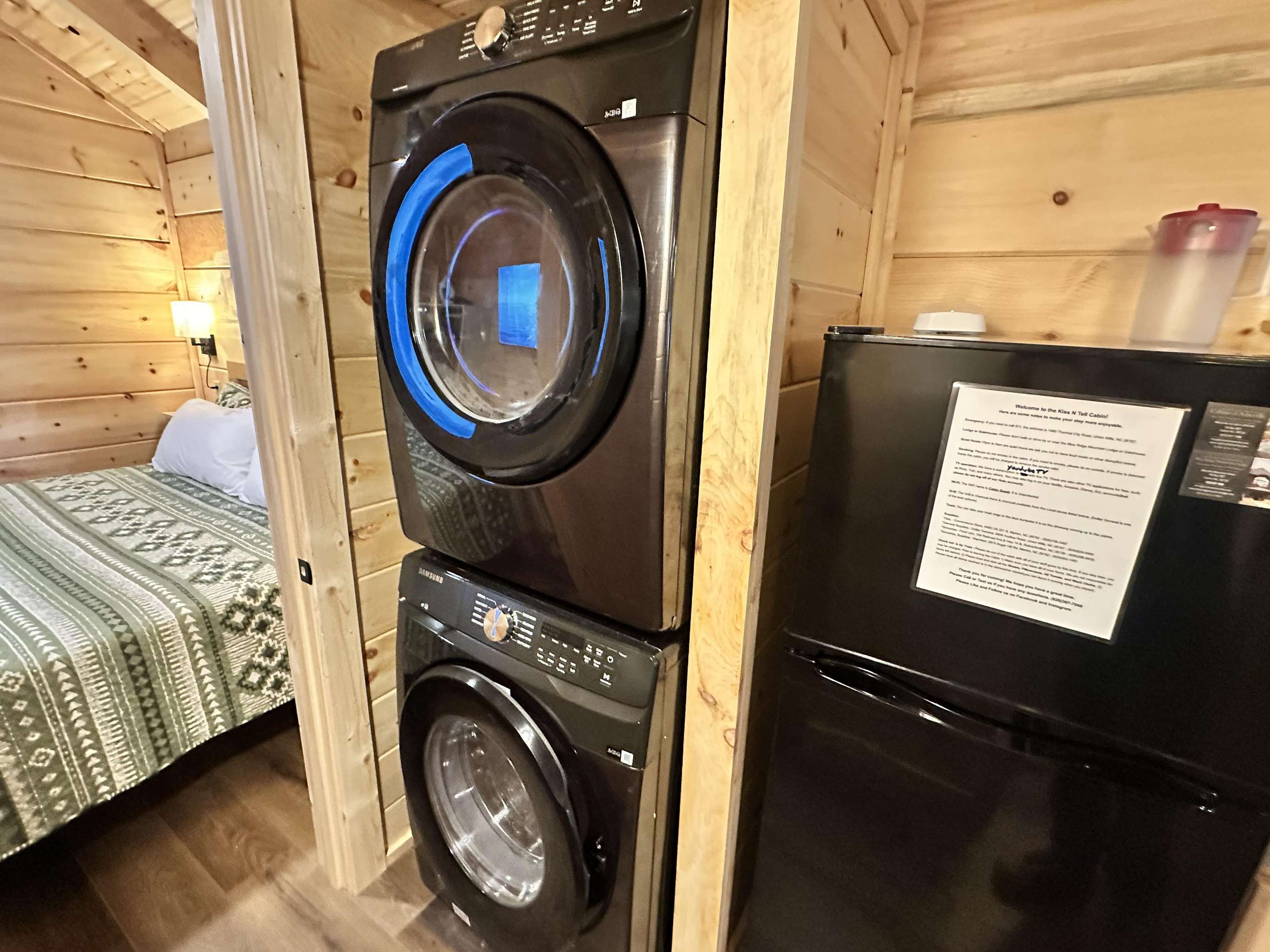 The Kiss N Tell cabin has log decor throughout. There is a couch in the living room along with a coffee table. The bedroom has a King bed with cotton quilt. Cell phone service is Great and the WiFi is super fast in this cabin. Most guest are able to use WiFi calling also while at these. There is a charcoal grill outside. The private, covered porch has a hot tub, two chairs, and a table. This cabin overlooks a meadow in the winter time and has a wooded view in the summer time.. This cabin is pet friendly!!! The Kiss N Tell cabin is just perfect