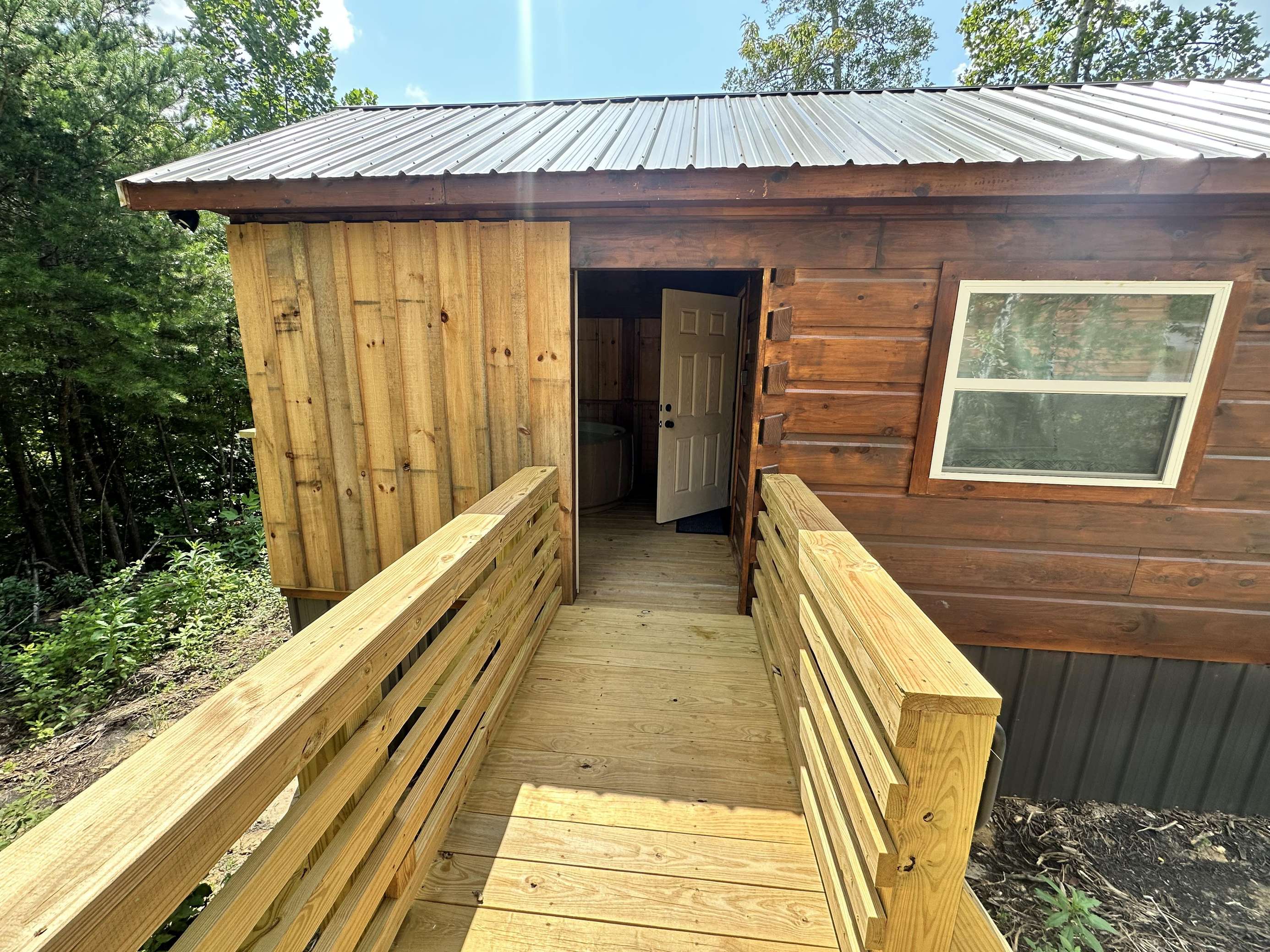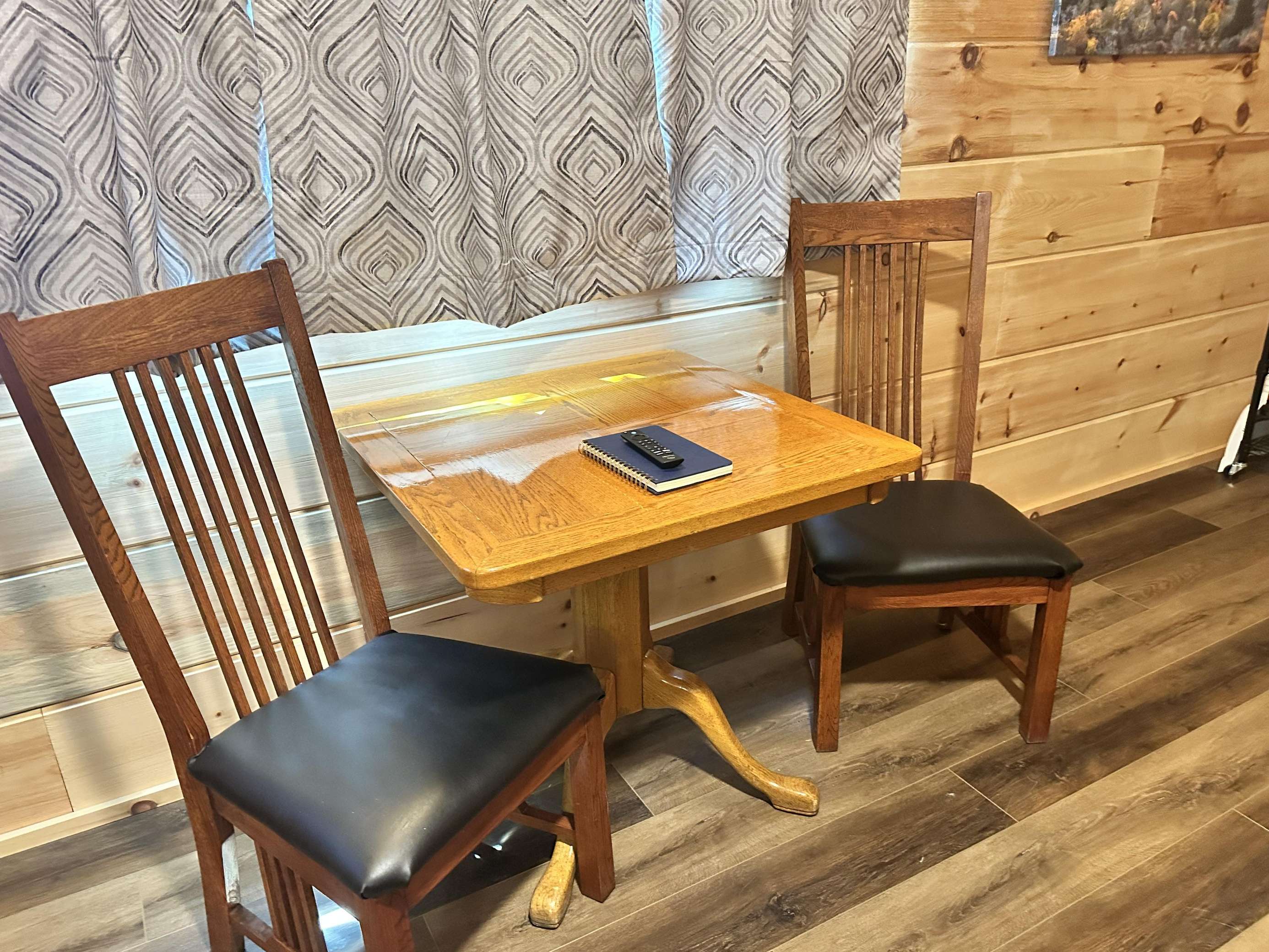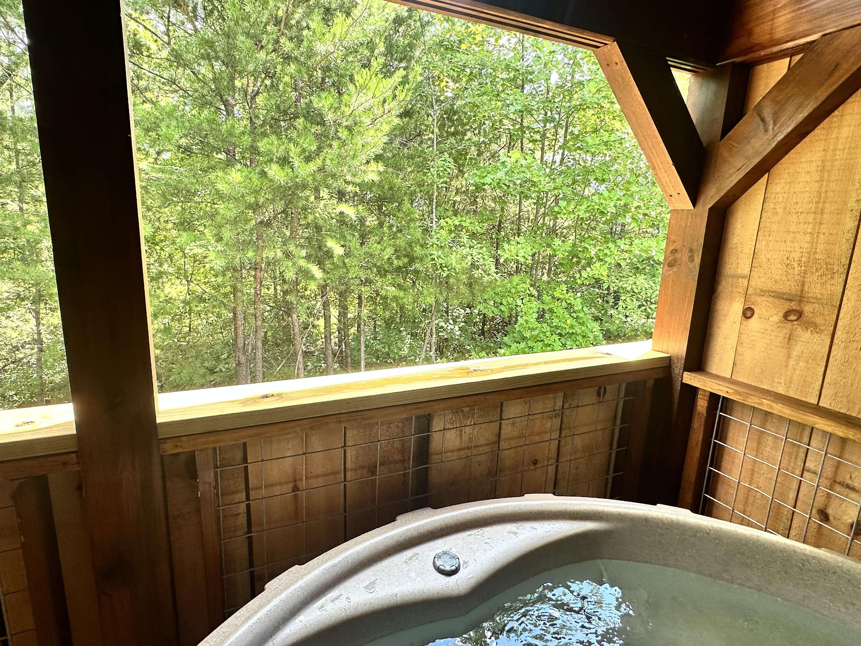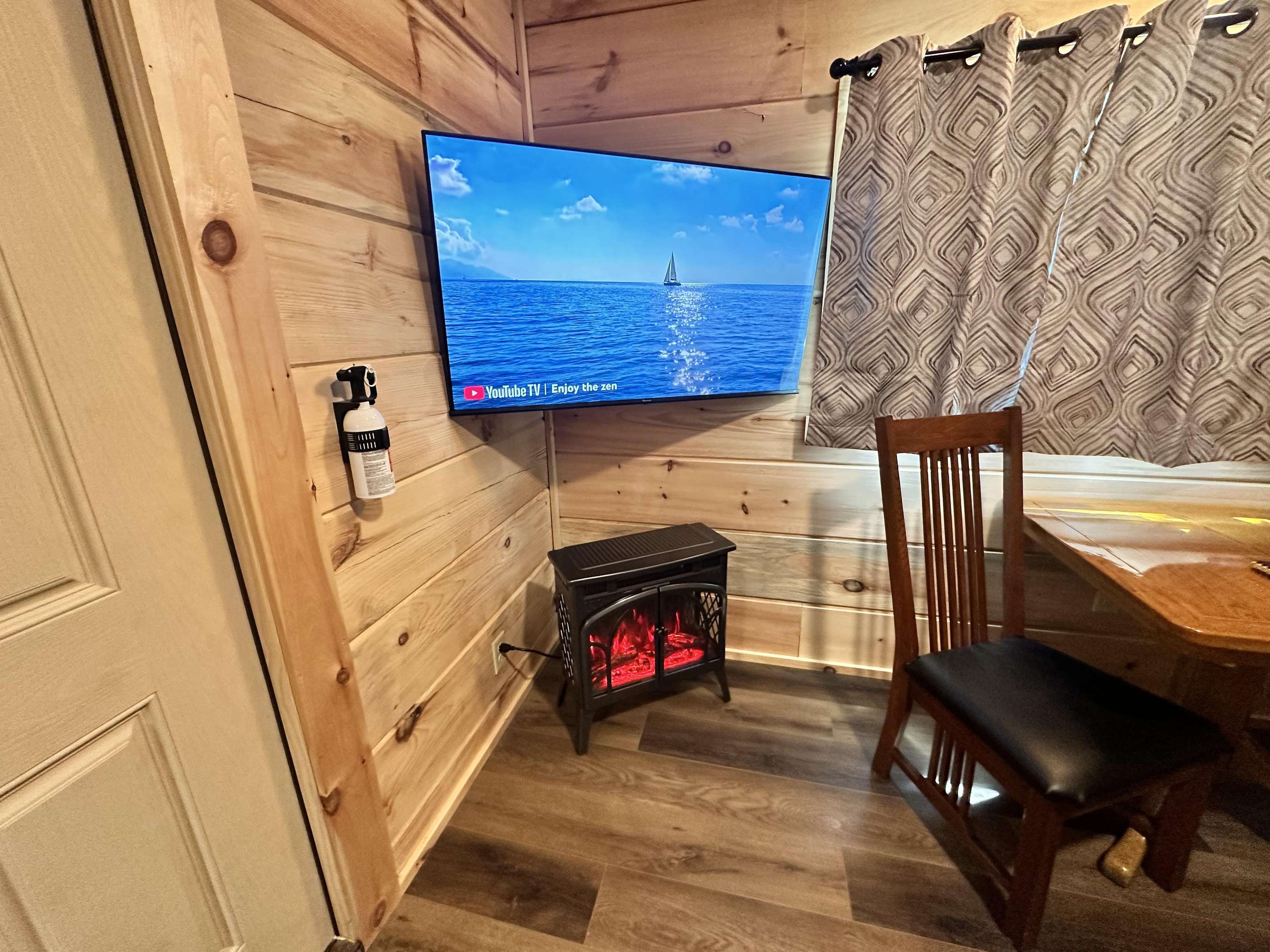 The Kiss N Tell cabin has log decor throughout. There is a couch in the living room along with a coffee table. The bedroom has a King bed with cotton quilt. Cell phone service is Great and the WiFi is super fast in this cabin. Most guest are able to use WiFi calling also while at these. There is a charcoal grill outside. The private, covered porch has a hot tub, two chairs, and a table. This cabin overlooks a meadow in the winter time and has a wooded view in the summer time.. This cabin is pet friendly!!! The Kiss N Tell cabin is just perfect